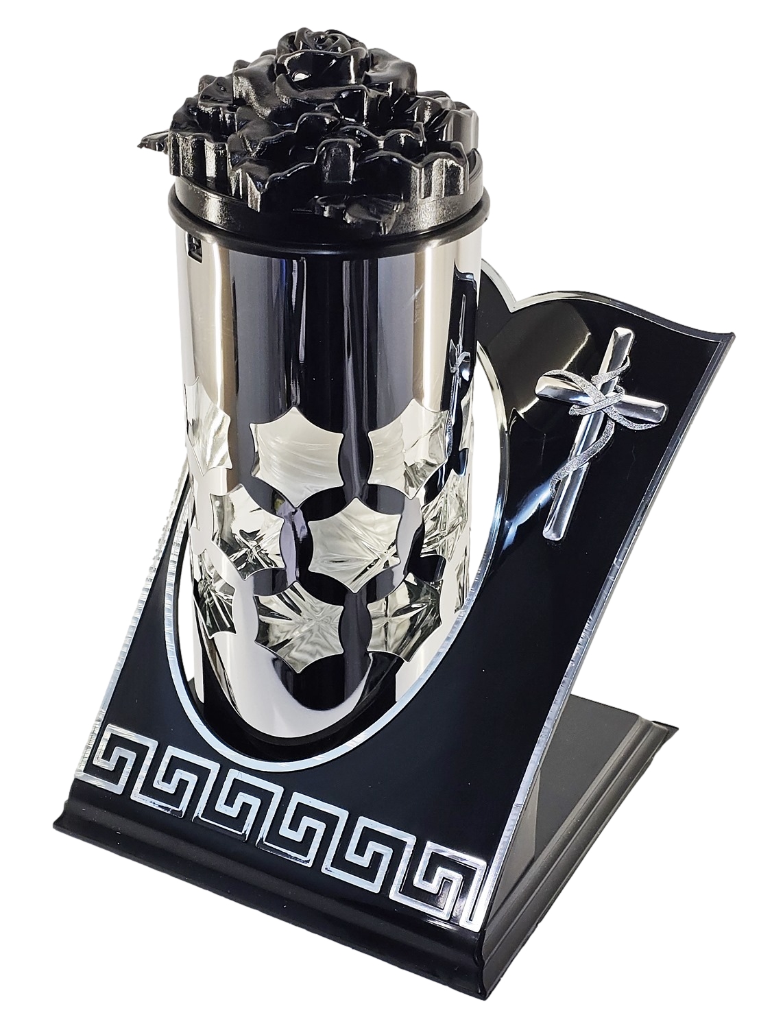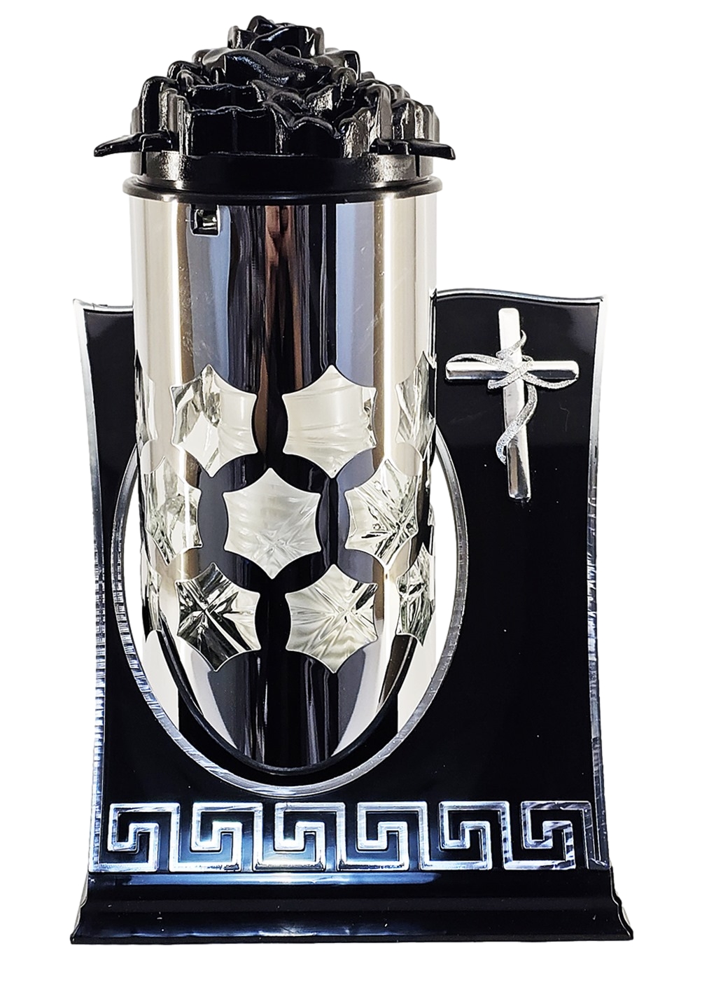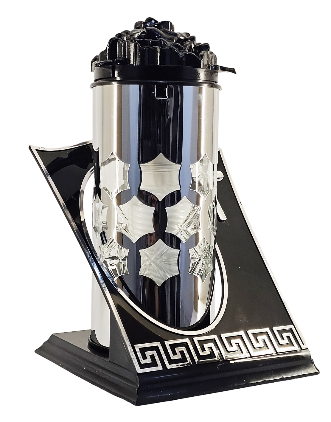 - Luksusowy Design: Połączenie głębokiej czerni ze srebrem oraz prestiżowy motyw greckiego meandra przy podstawie.
