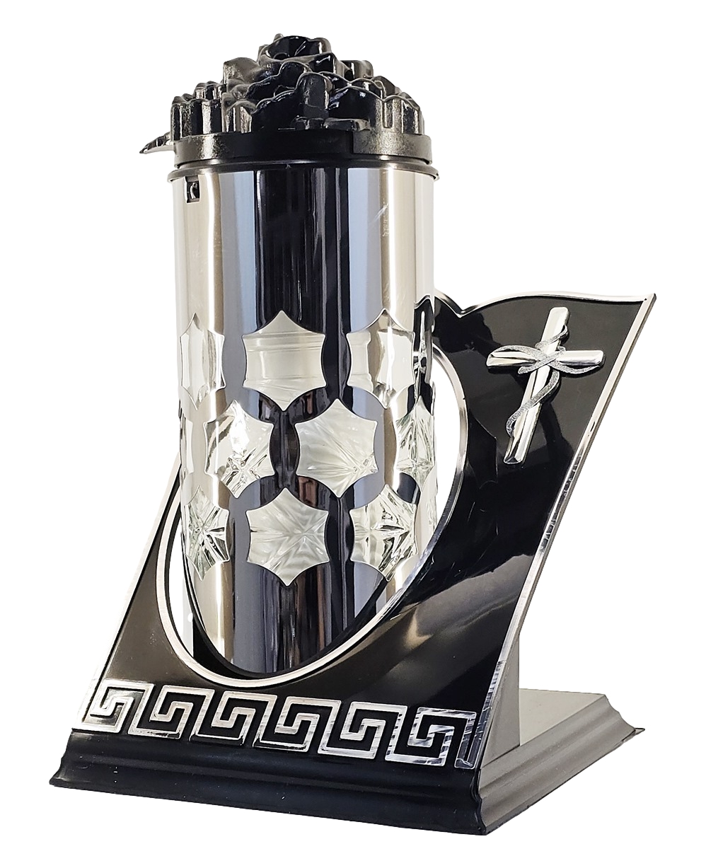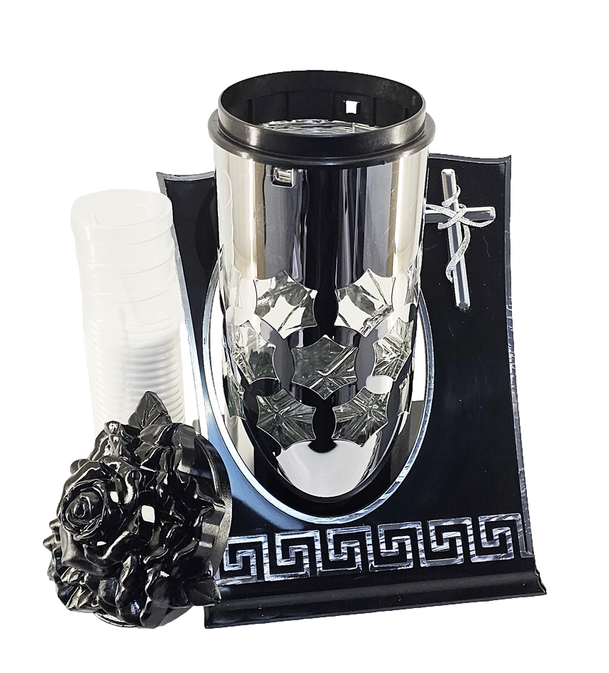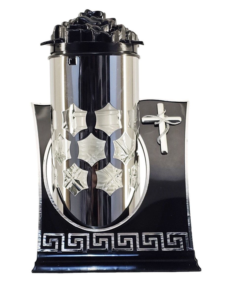 - Luksusowy Design: Połączenie głębokiej czerni ze srebrem oraz prestiżowy motyw greckiego meandra przy podstawie.