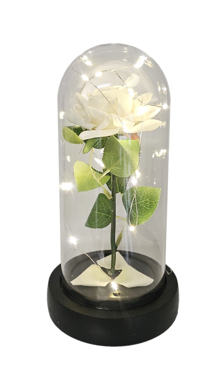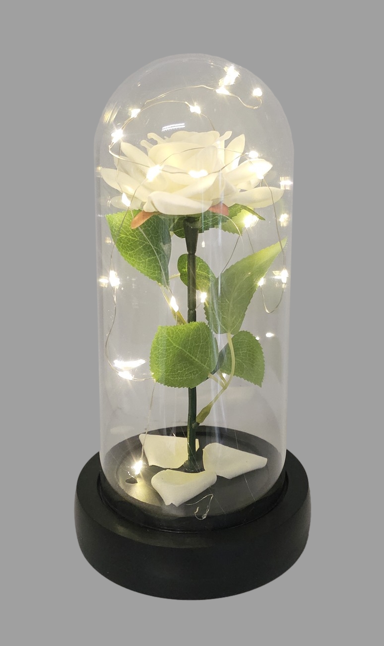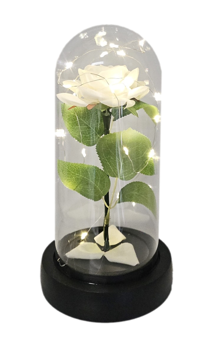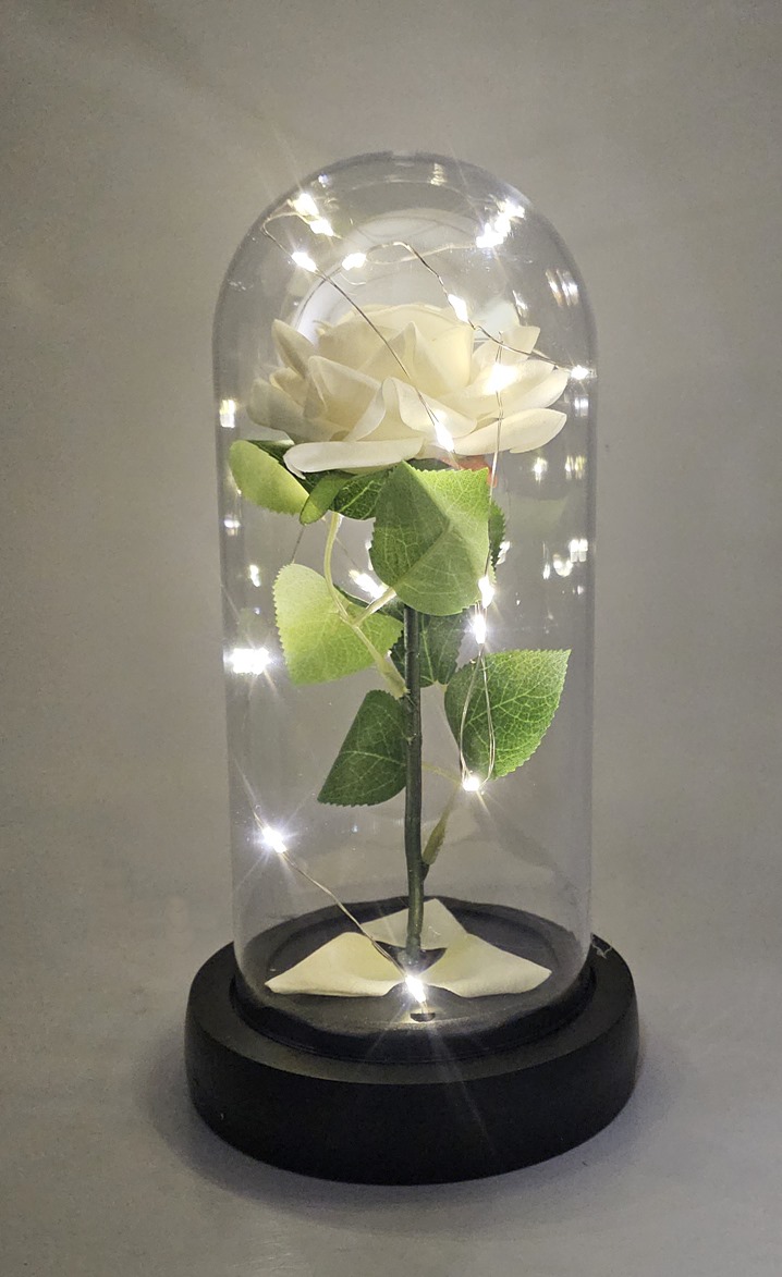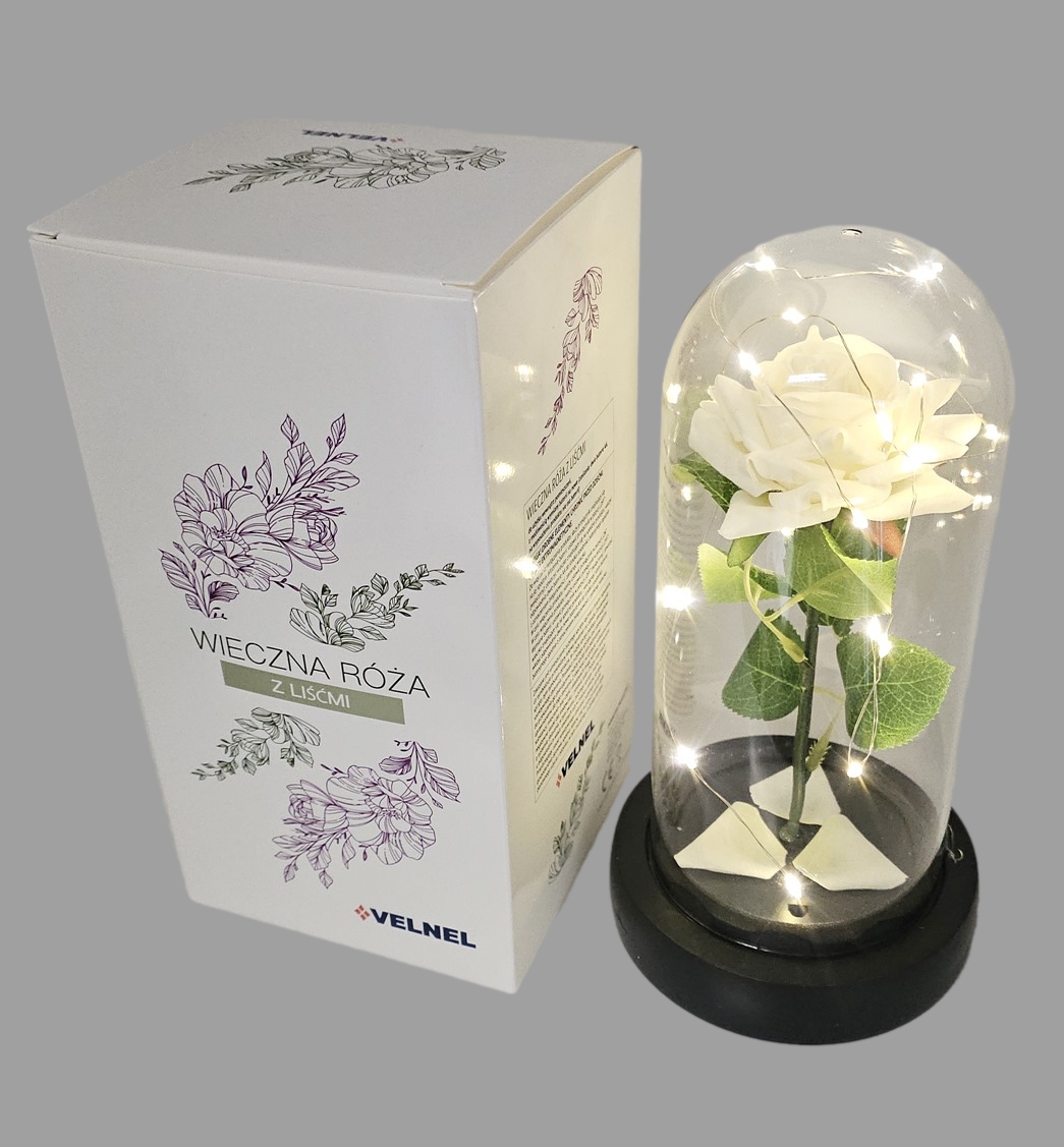 Światło LED: delikatne i romantyczne, kolor biały ciepły, oświetlające różę z każdej strony