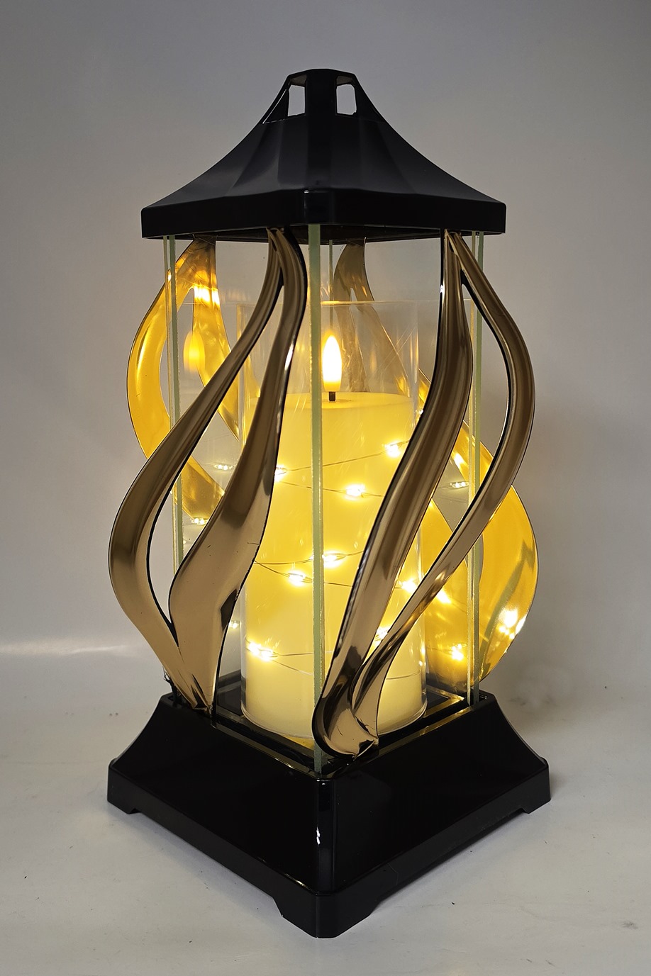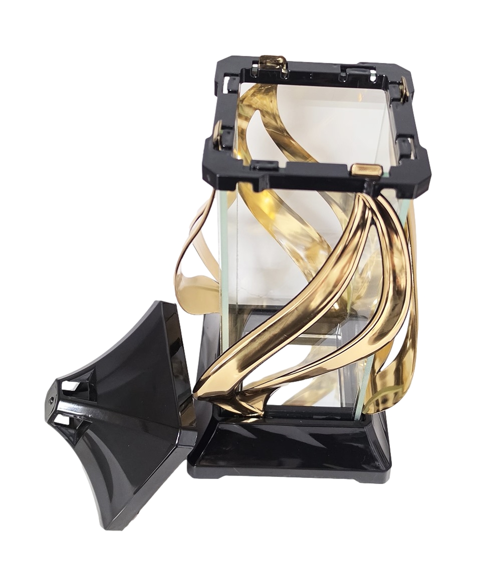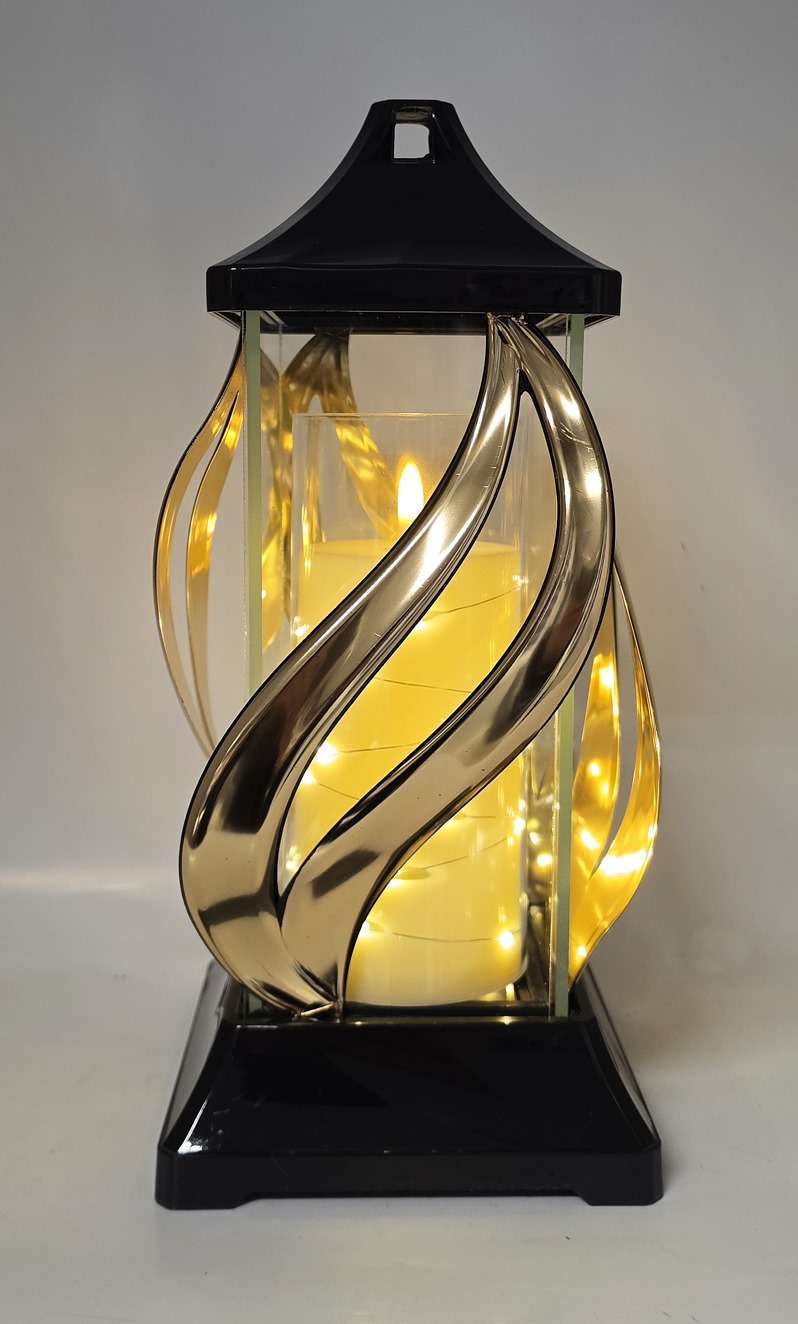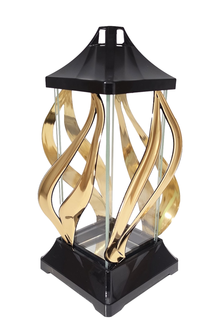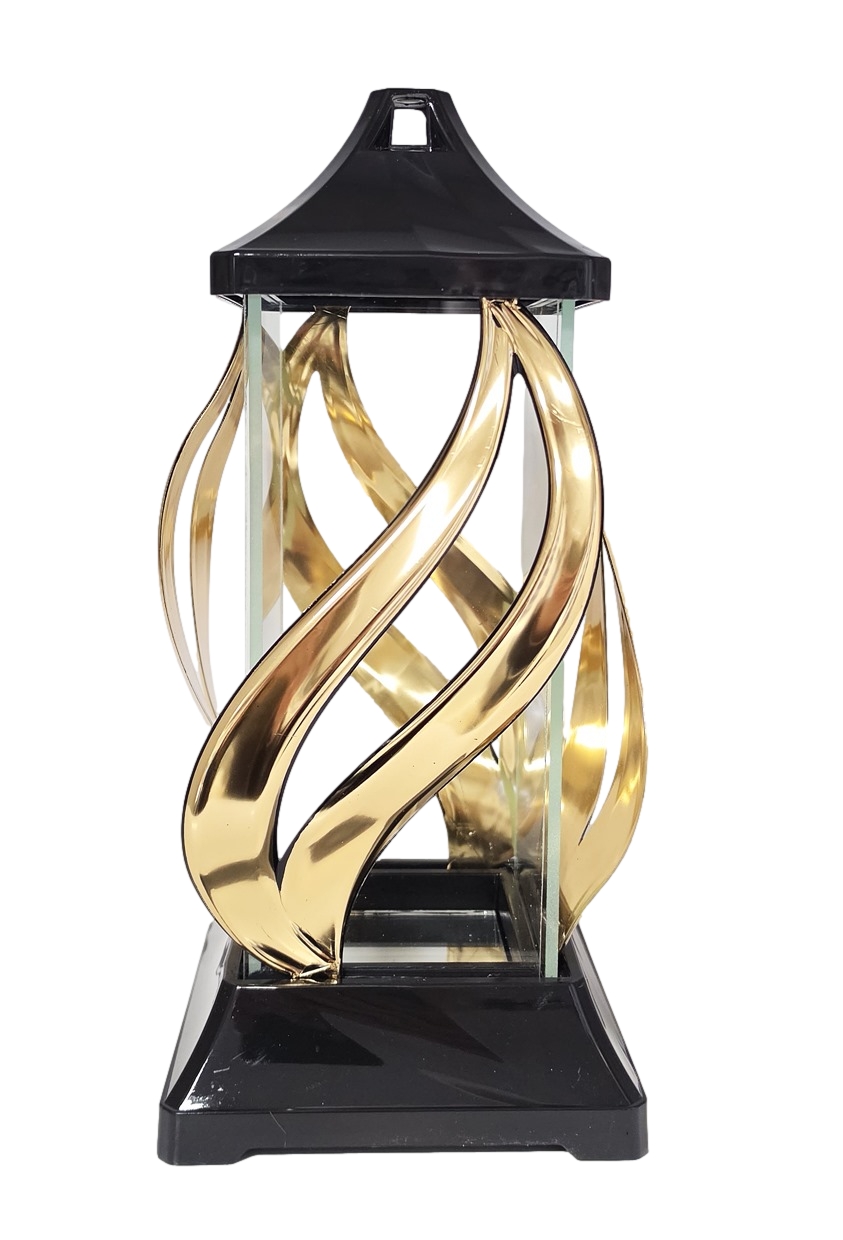 - kolor znicza: Czarno-złoty, szkło przezroczyste + tworzywo czarne. Ozdoba z tworzywa metalizowanego . Pokrywa i podstawa z czarnego tworzywa