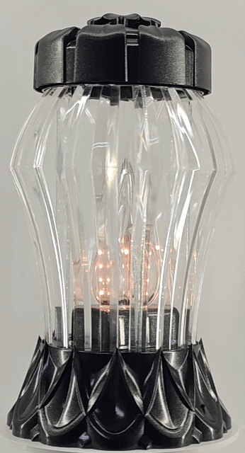- kolor znicza: szyby przezroczyste + tworzywo ażurowe bezbarwne dookoła. Pokrywa i podstawa z czarnego lakierowanego tworzywa