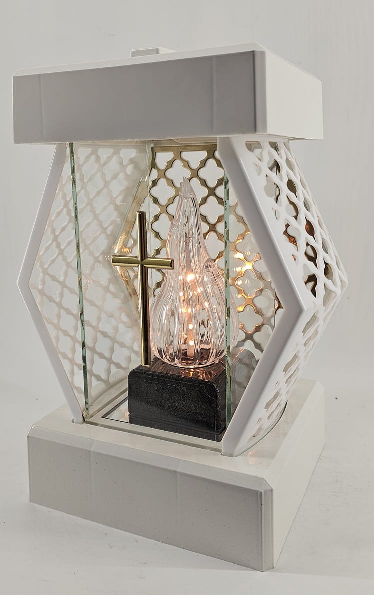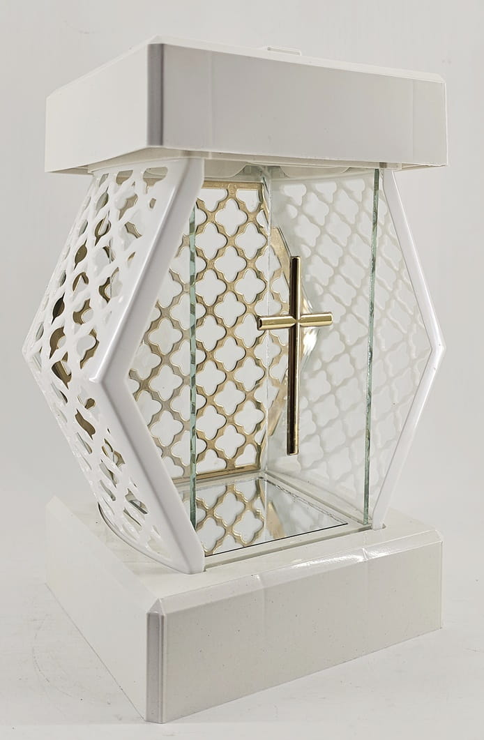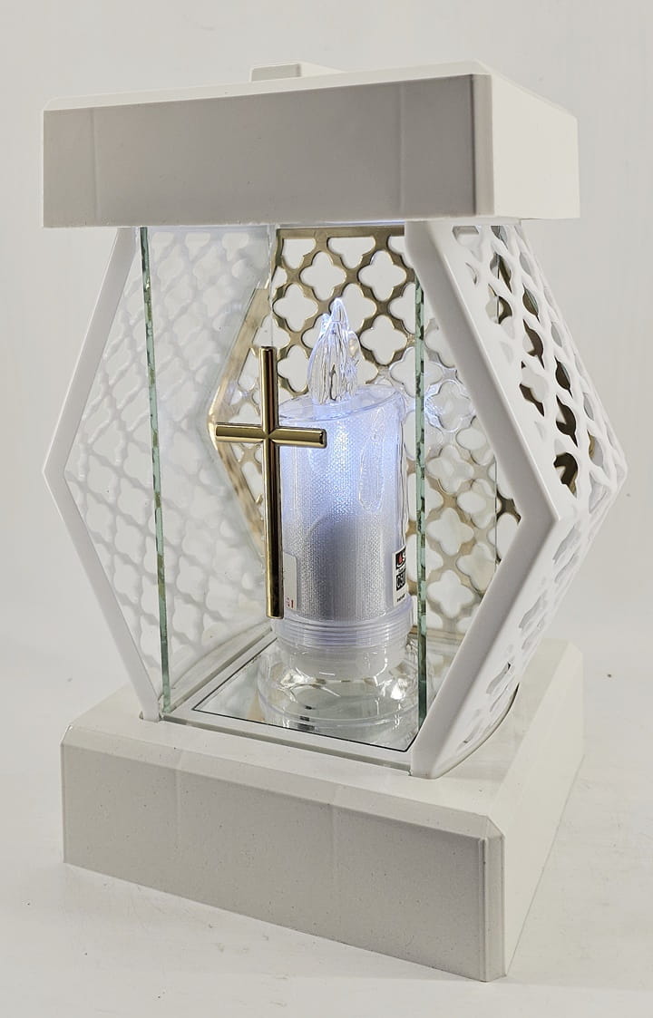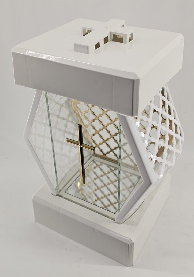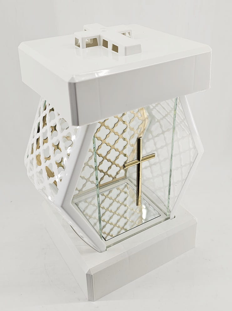 - kolor znicza: Biały, szyba przezroczysta + tworzywo białe lakierowane. Boki z tworzywa i szkła. Tył znicza to szyba. Pokrywa i podstawa z białego lakierowanego tworzywa
