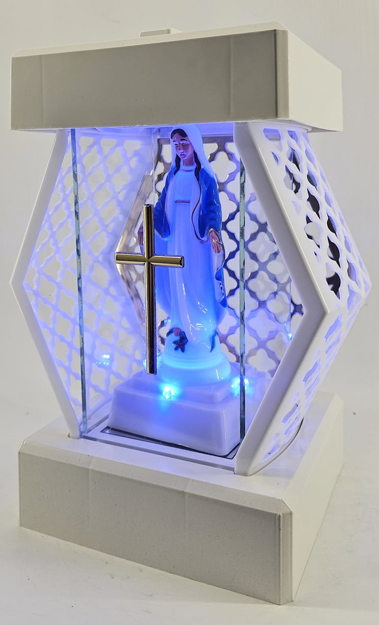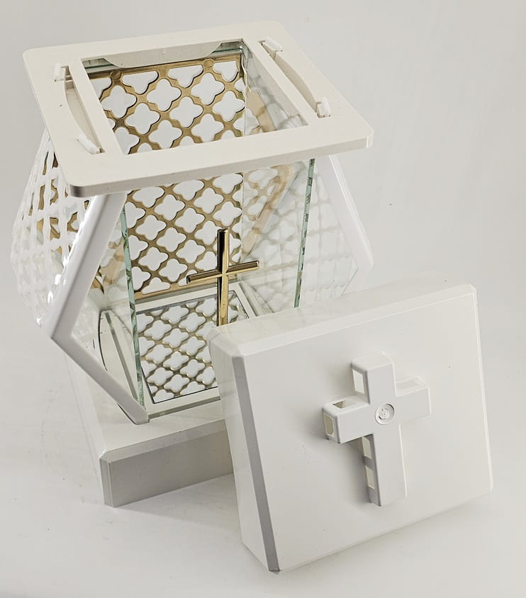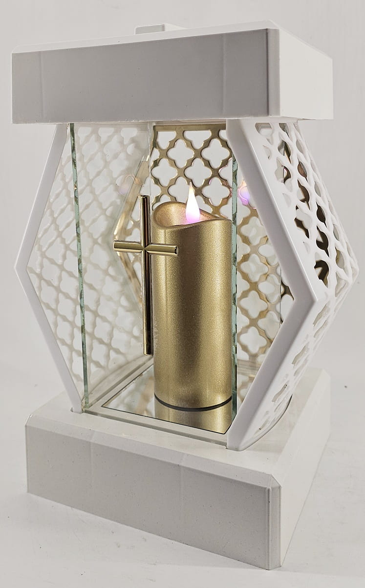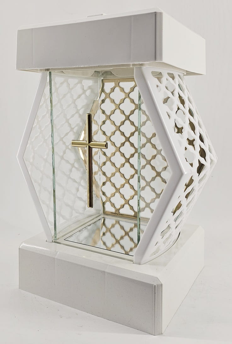 - kolor znicza: Biały, szyba przezroczysta + tworzywo białe lakierowane. Boki z tworzywa i szkła. Tył znicza to szyba. Pokrywa i podstawa z białego lakierowanego tworzywa