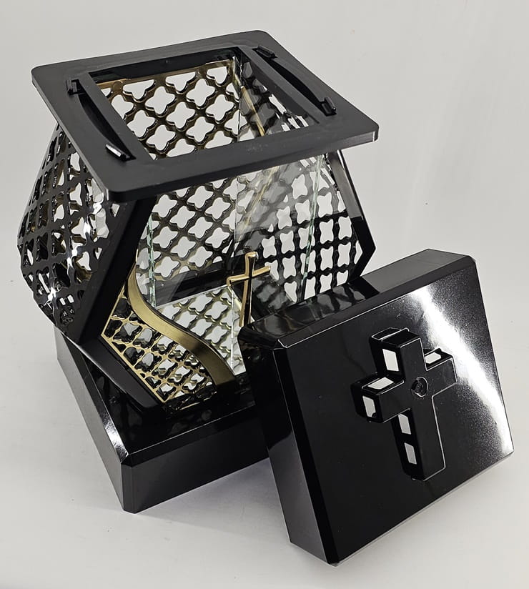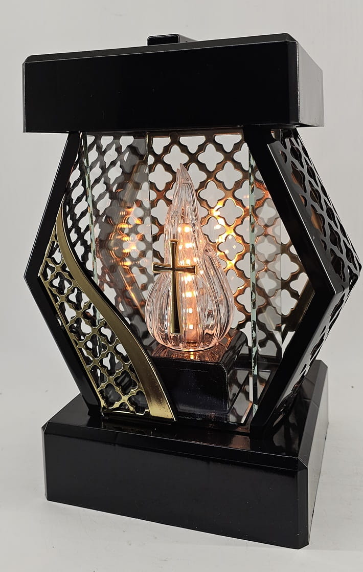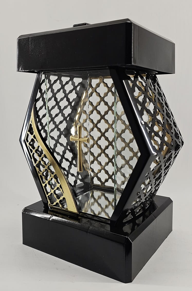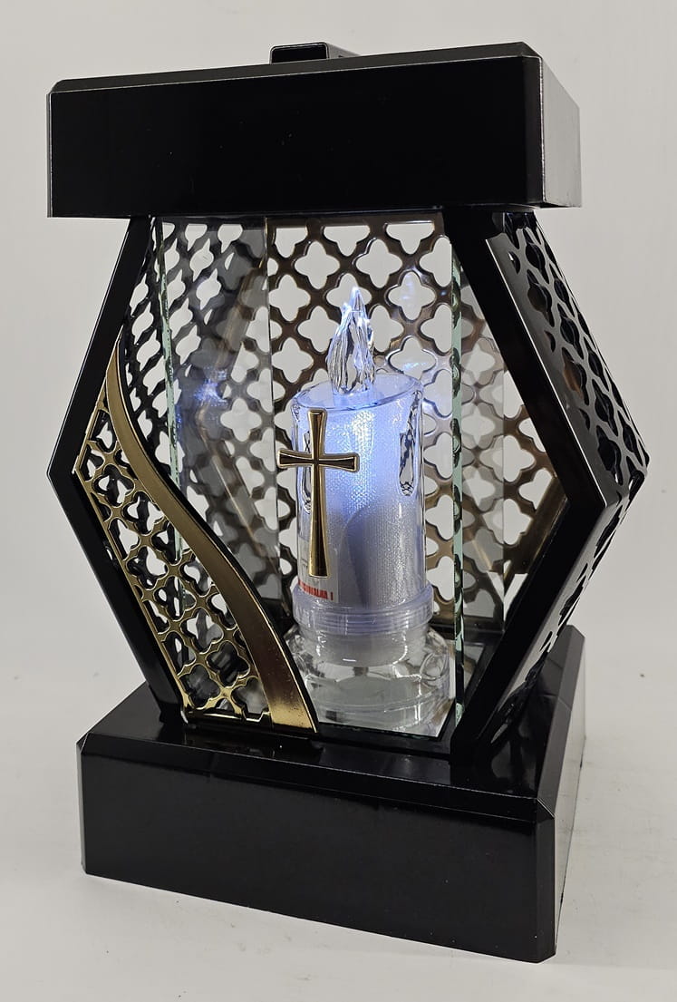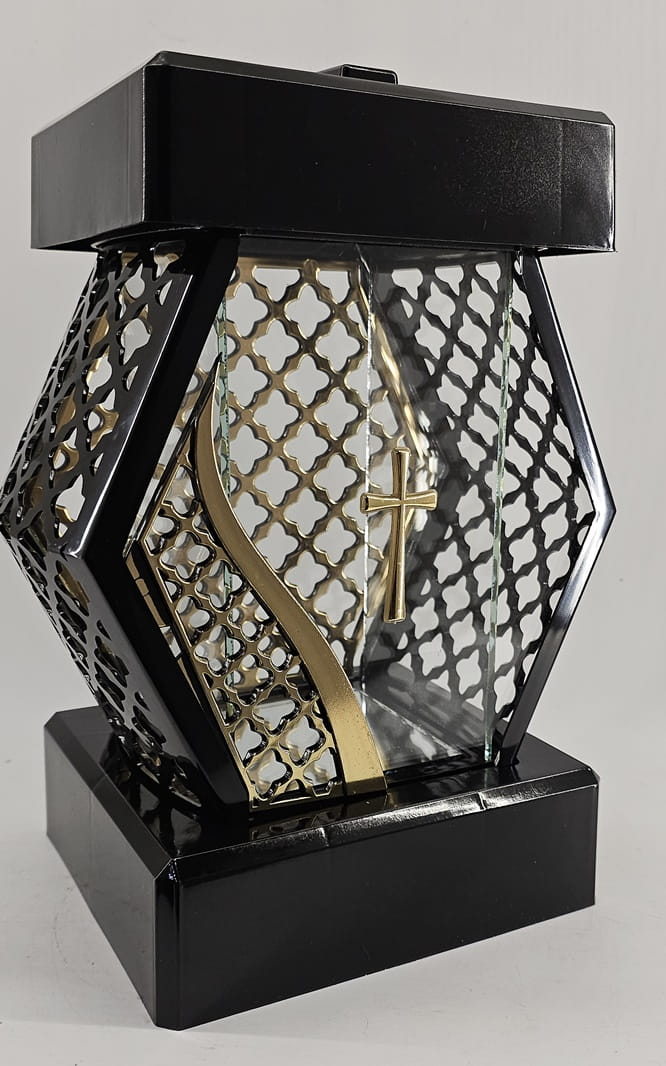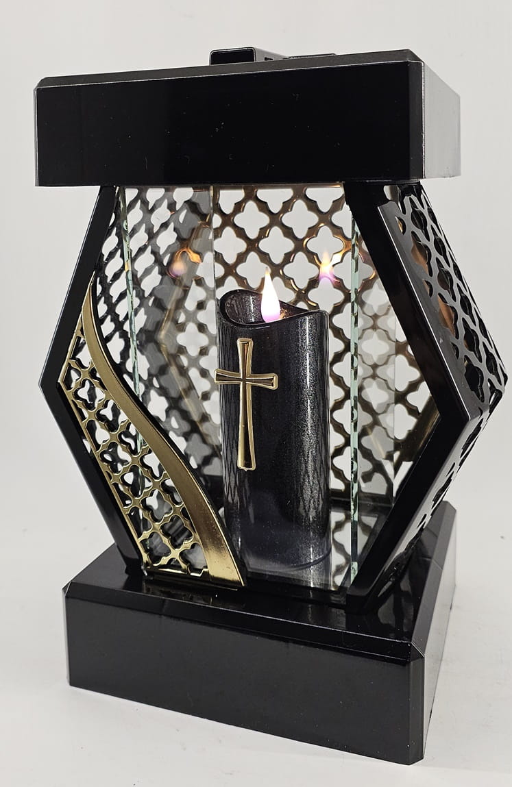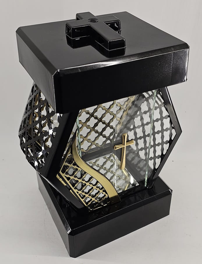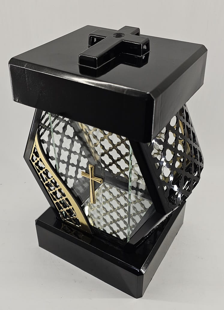 - kolor znicza: Czarny, szyba przezroczysta + tworzywo czarne lakierowane. Boki z tworzywa i szkła. Tył znicza to szyba. Pokrywa i podstawa z czarnego lakierowanego tworzywa