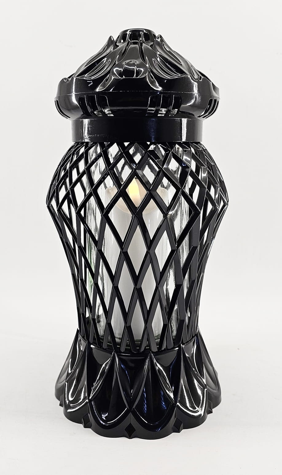 - kolor znicza: Czarny, tuba szklana przezroczysta + tworzywo czarne lakierowane. Boki z ażurowego tworzywa. Wewnątrz szklany znicz. Pokrywa i podstawa z czarnego lakierowanego tworzywa