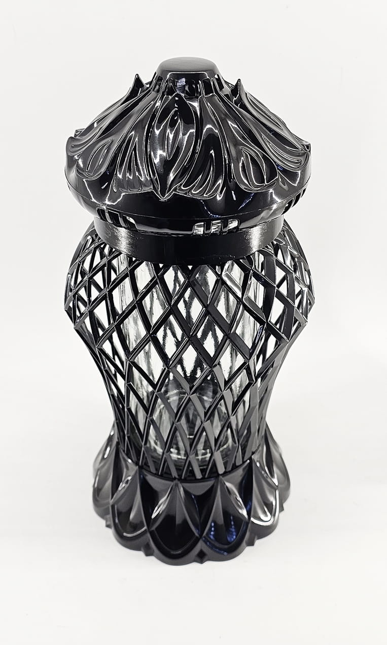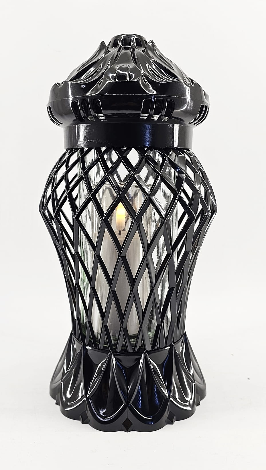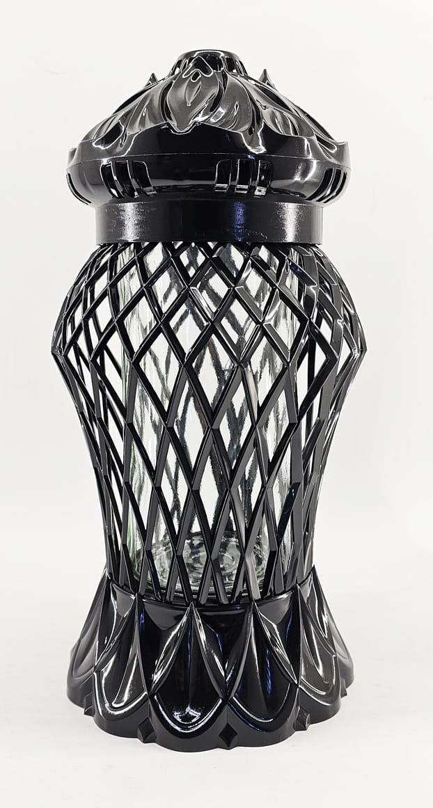 - kolor znicza: Czarny, tuba szklana przezroczysta + tworzywo czarne lakierowane. Boki z ażurowego tworzywa. Wewnątrz szklany znicz. Pokrywa i podstawa z czarnego lakierowanego tworzywa