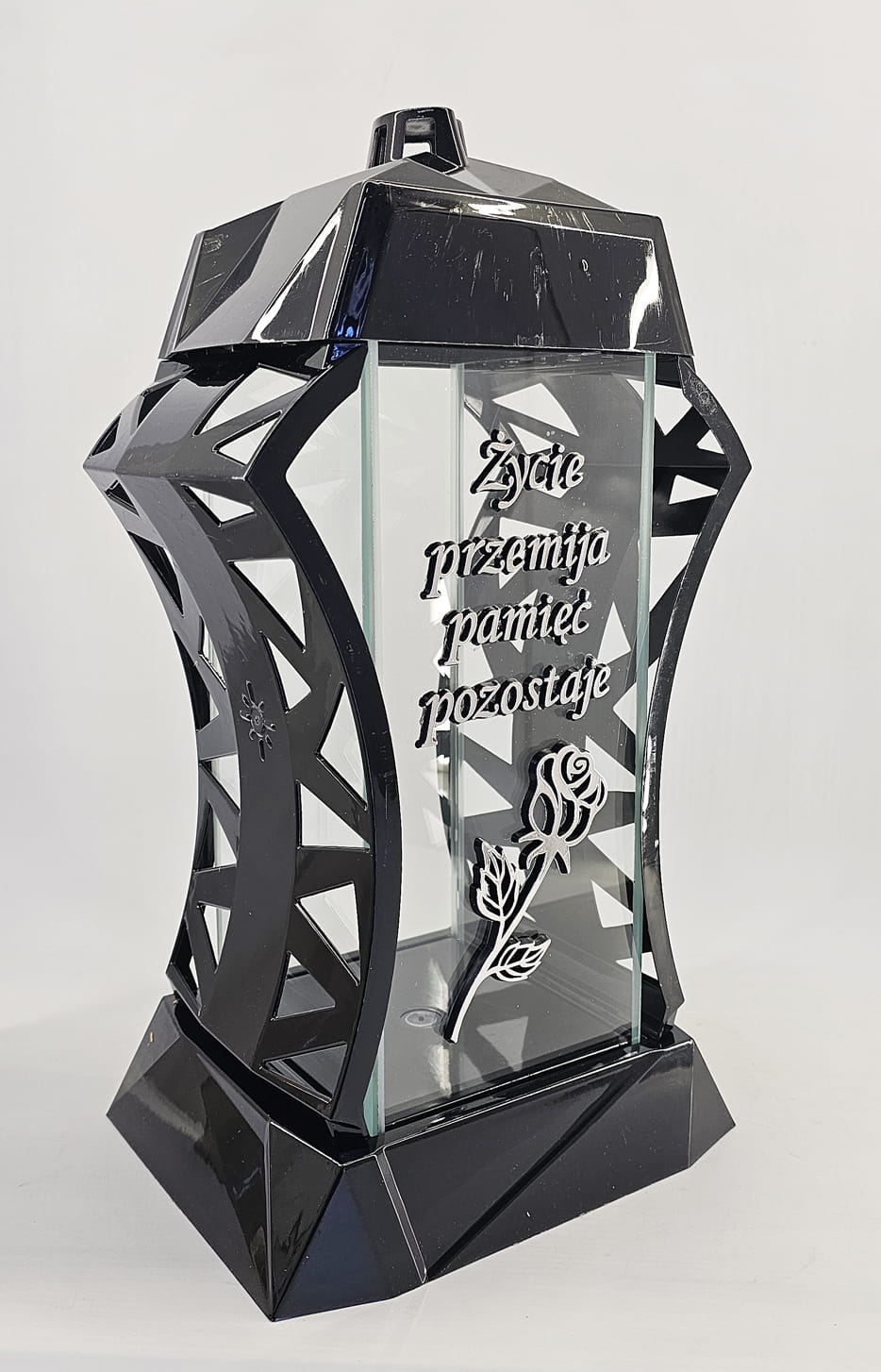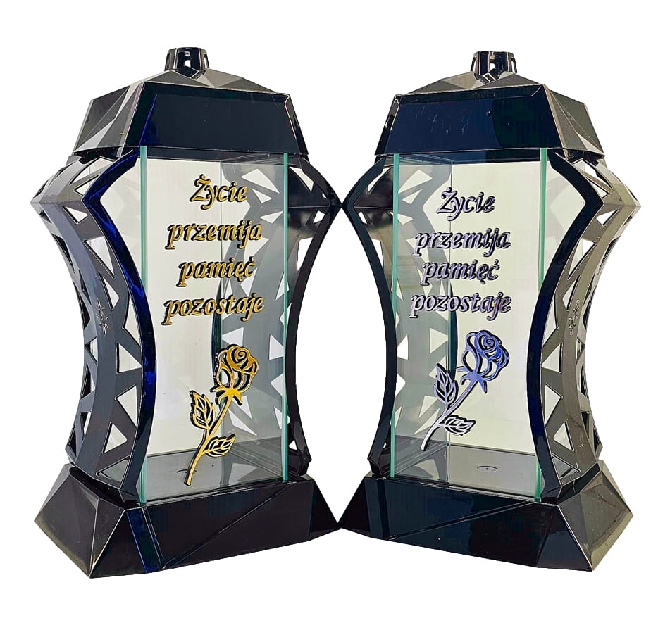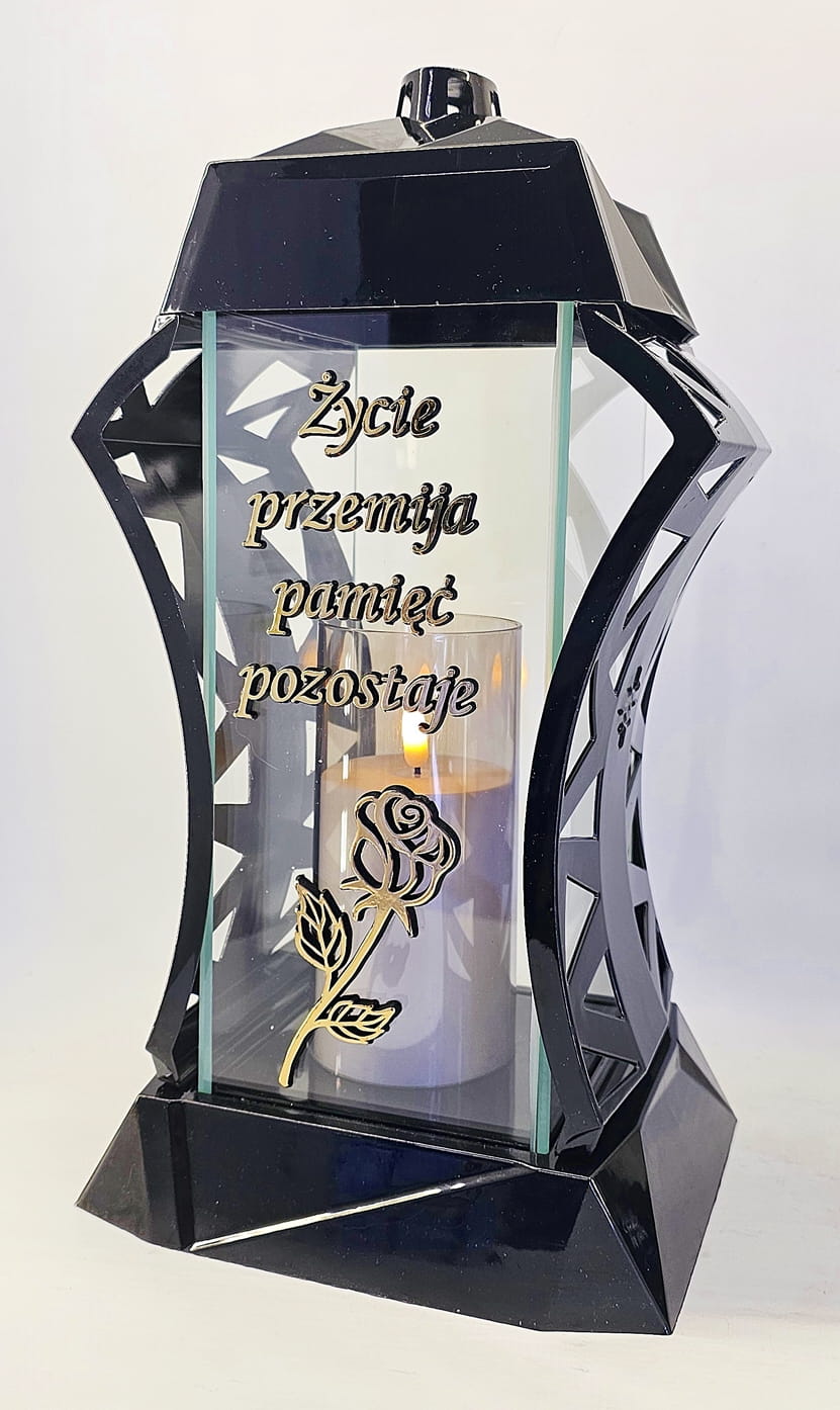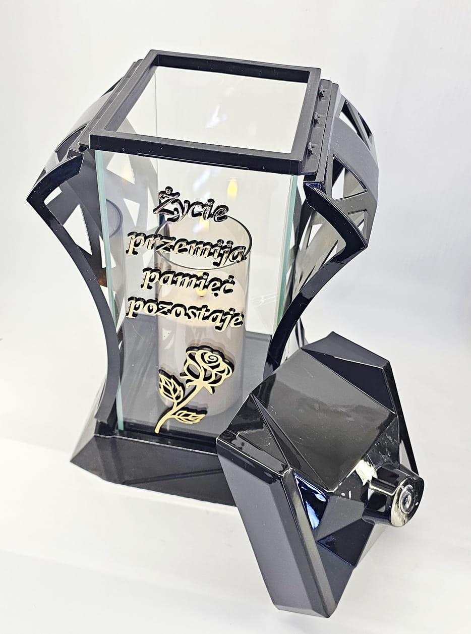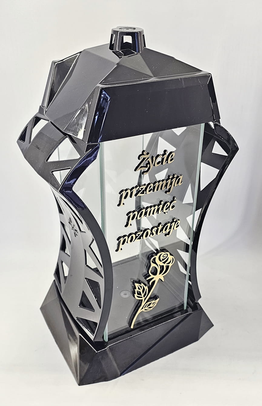 - kolor znicza: Czarny, 4 szyby przezroczyste + tworzywo czarne lakierowane. Boki z ażurowego tworzywa. Pokrywa i podstawa z czarnego lakierowanego tworzywa