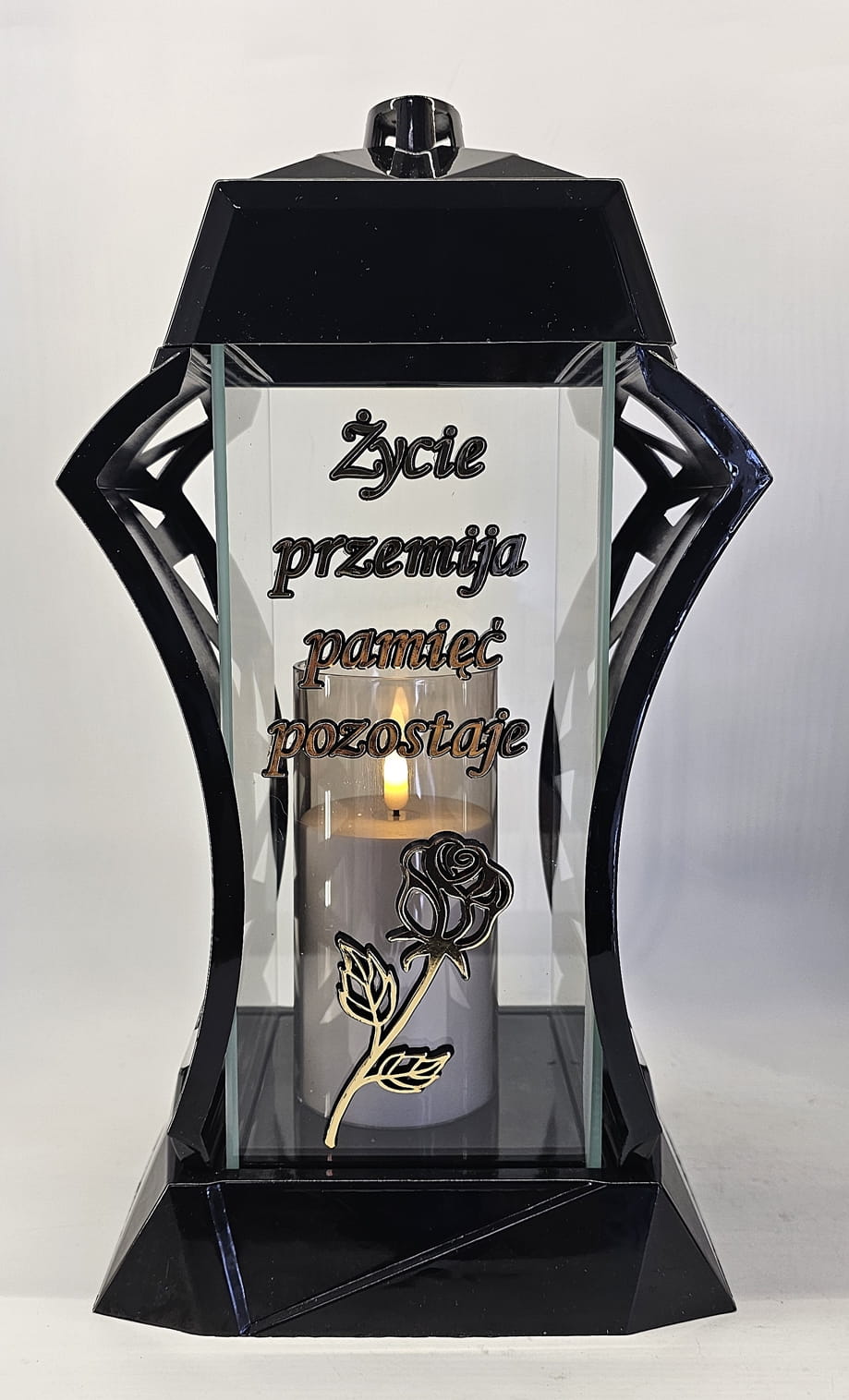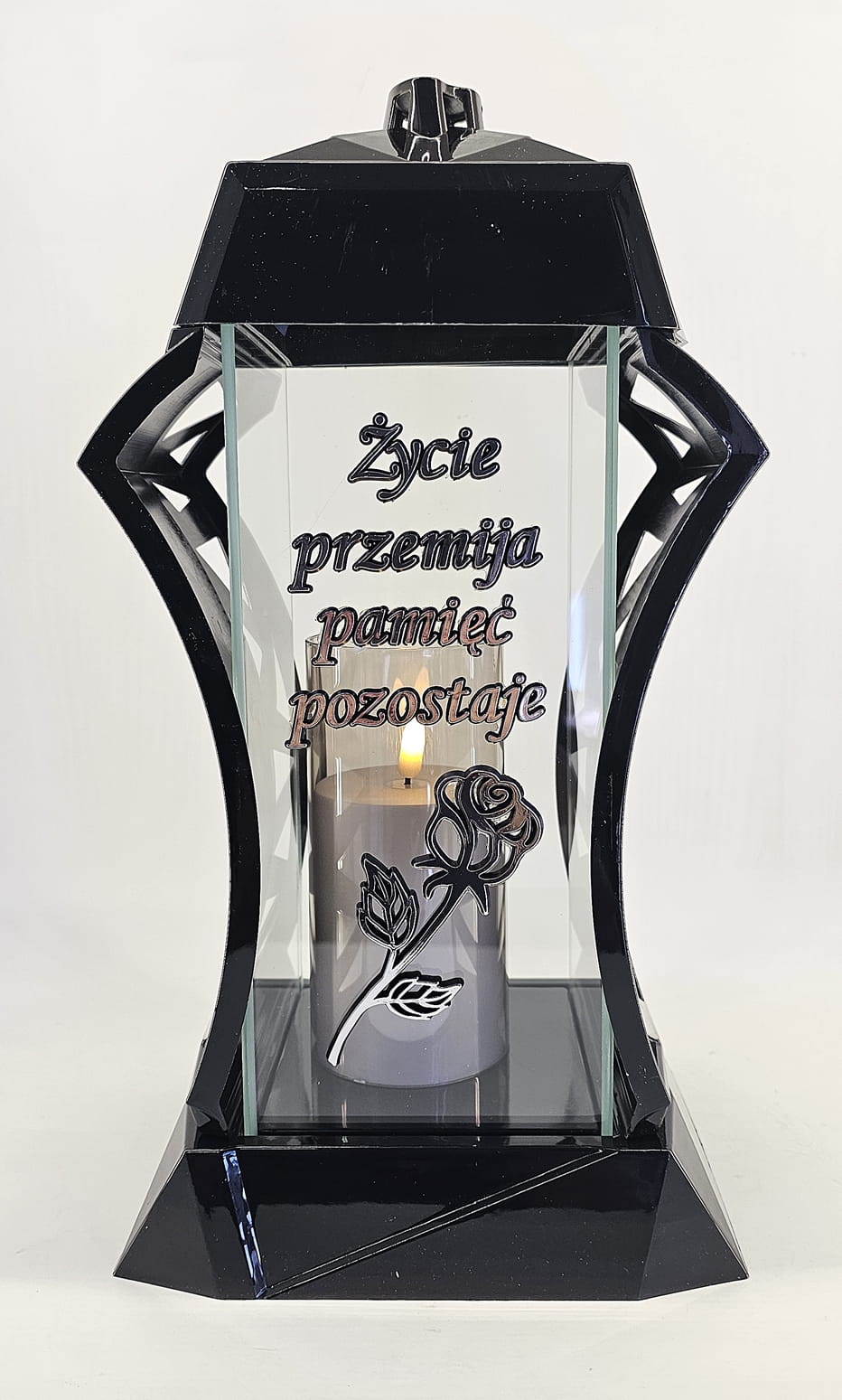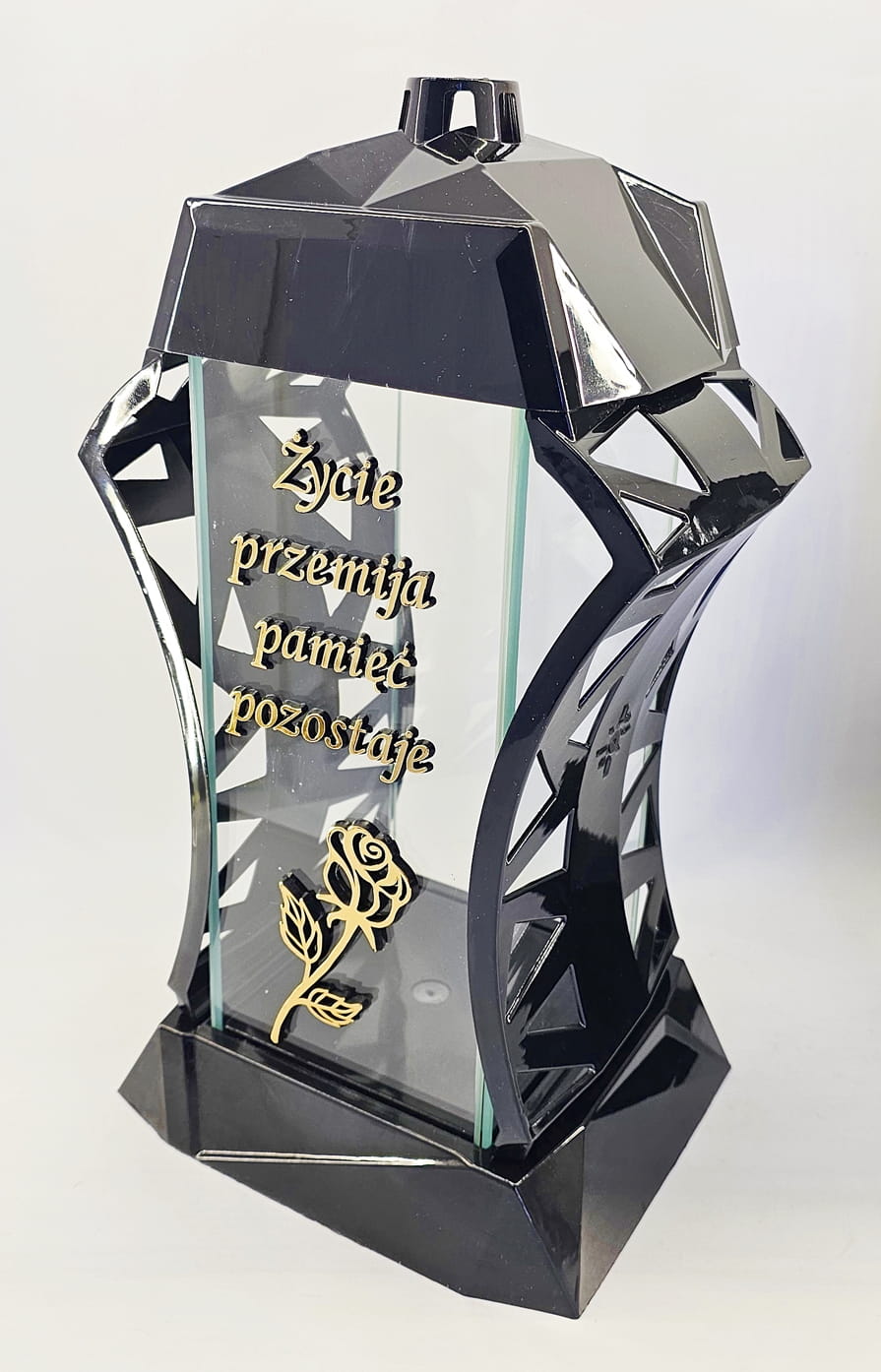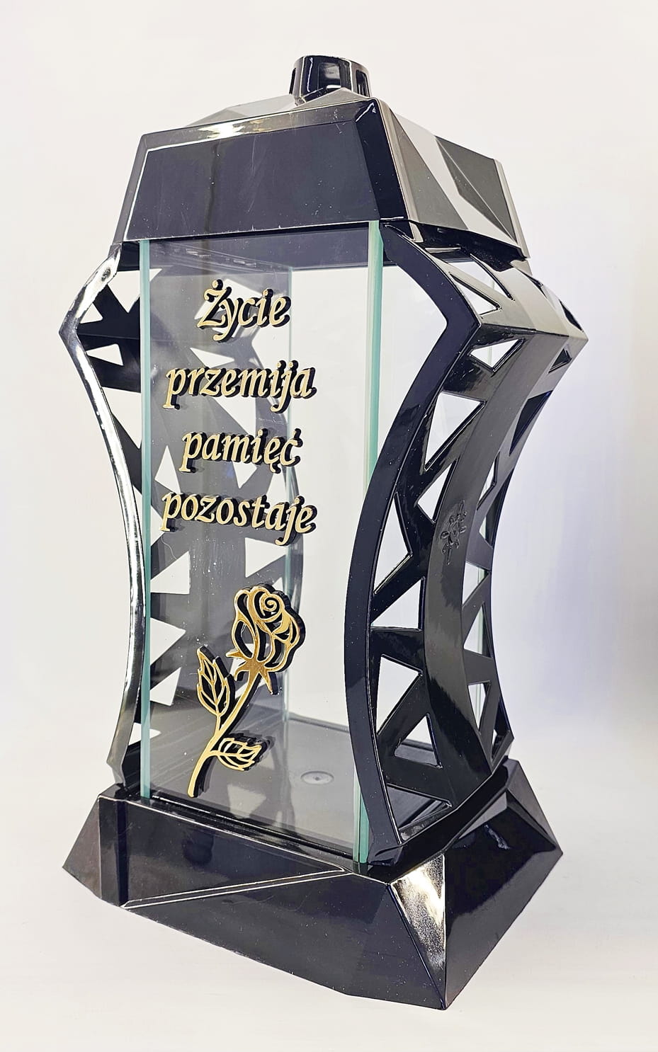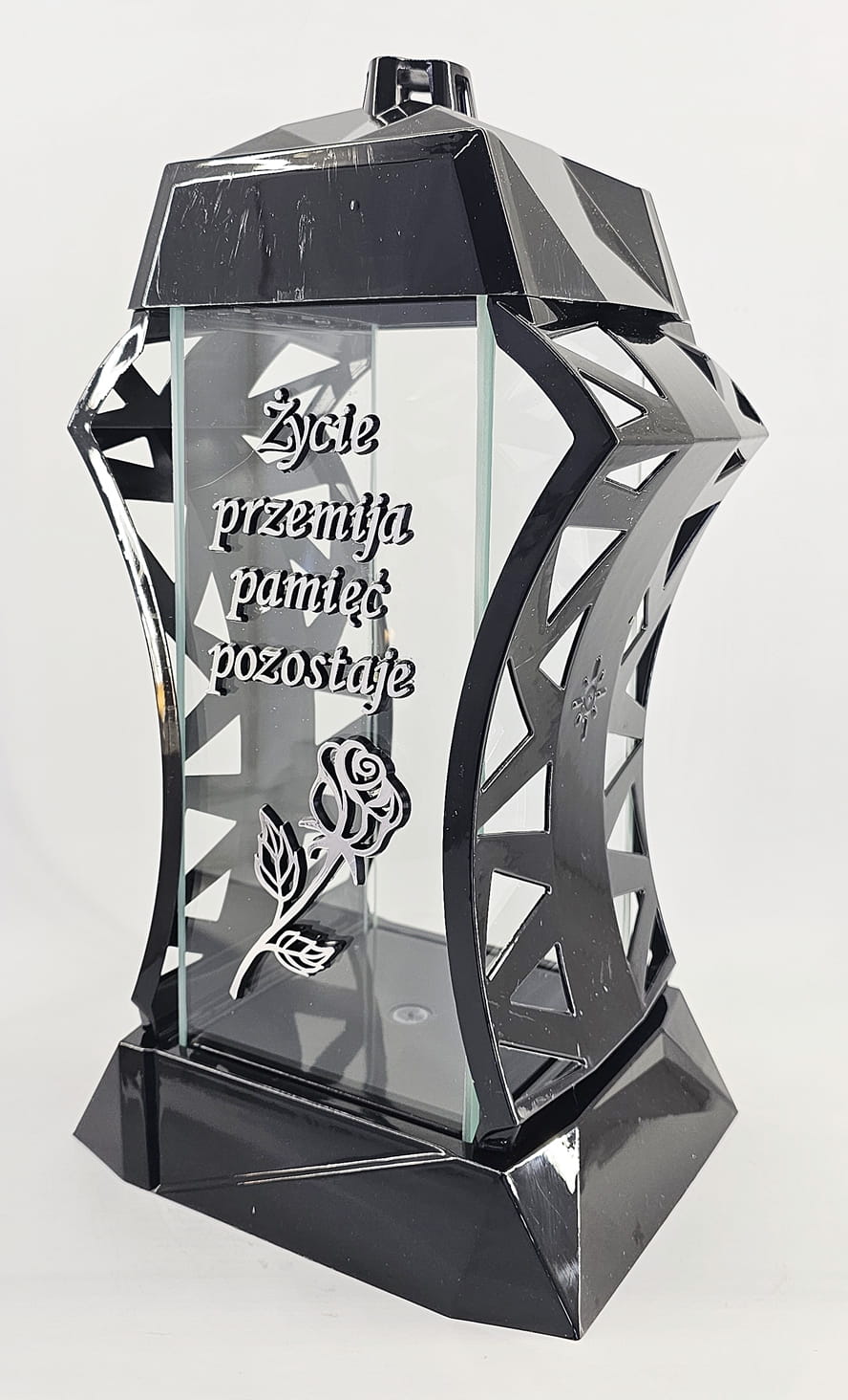 - kolor znicza: Czarny, 4 szyby przezroczyste + tworzywo czarne lakierowane. Boki z ażurowego tworzywa. Pokrywa i podstawa z czarnego lakierowanego tworzywa