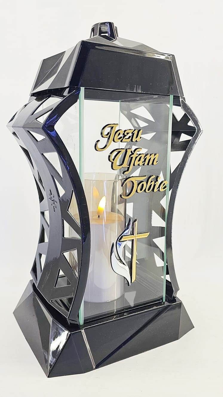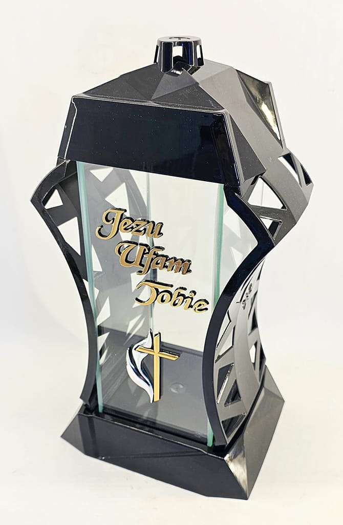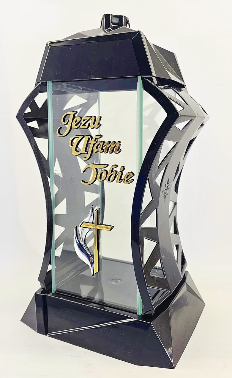 - kolor znicza: Czarny, 4 szyby przezroczyste + tworzywo czarne lakierowane. Boki z ażurowego tworzywa. Pokrywa i podstawa z czarnego lakierowanego tworzywa
