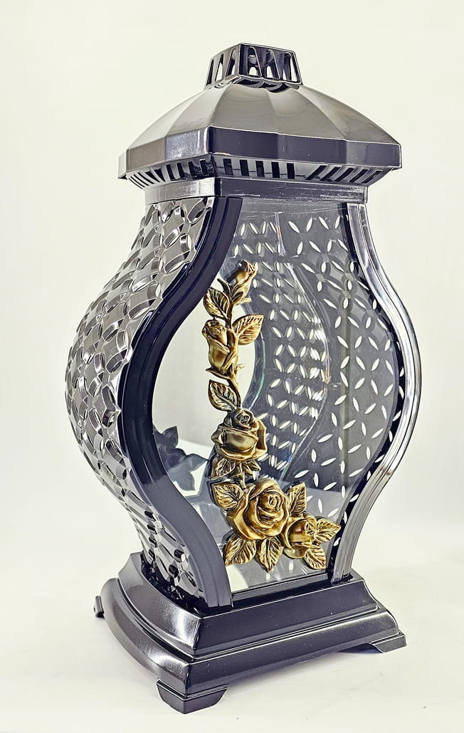 - kolor znicza: Czarny, szyba przezroczysta + tworzywo czarne lakierowane. Boki z tworzywa i szkła. Tył znicza to lustro. Pokrywa i podstawa z czarnego lakierowanego tworzywa