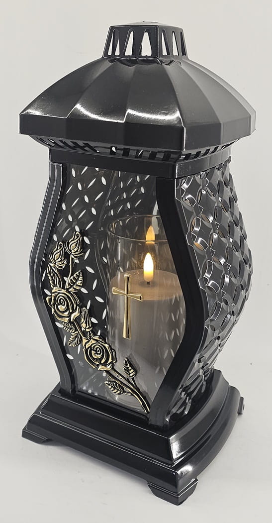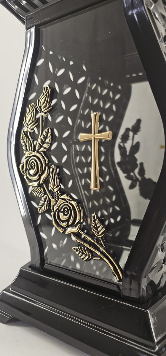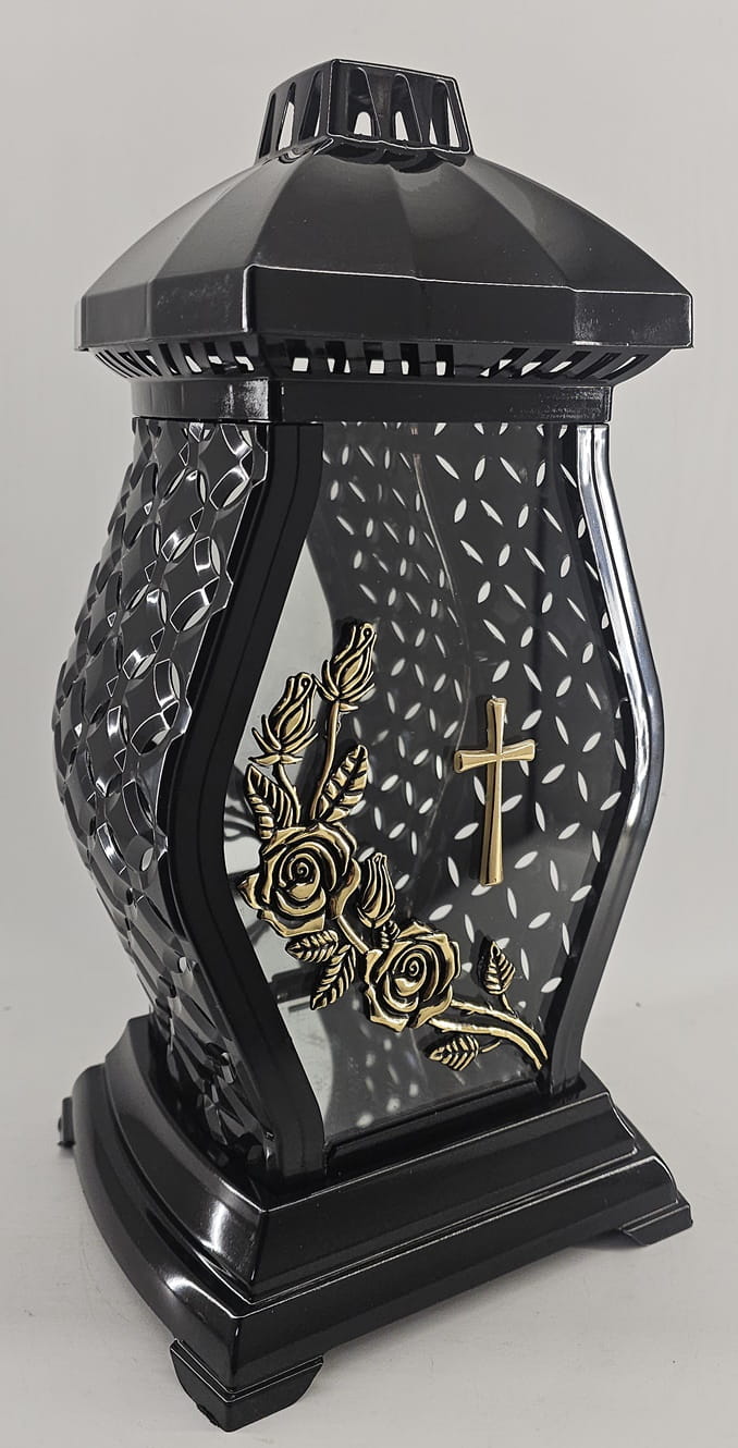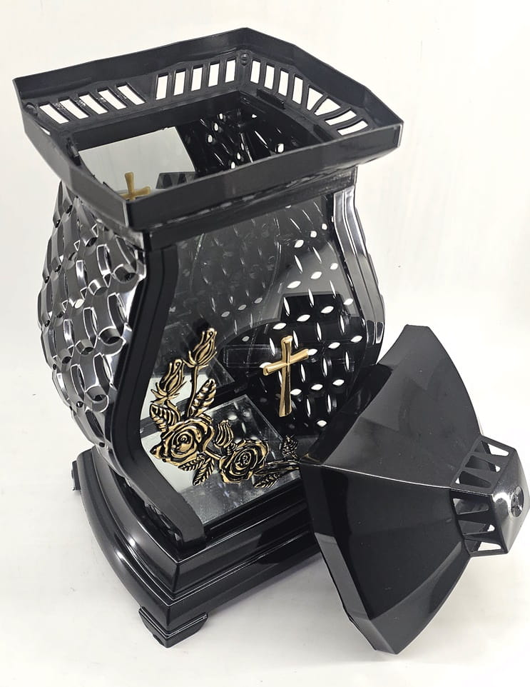 - kolor znicza: Czarny, szyba przezroczysta + tworzywo czarne lakierowane. Boki z tworzywa i szkła. Tył znicza to lustro. Pokrywa i podstawa z czarnego lakierowanego tworzywa