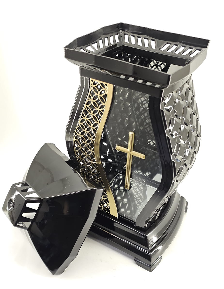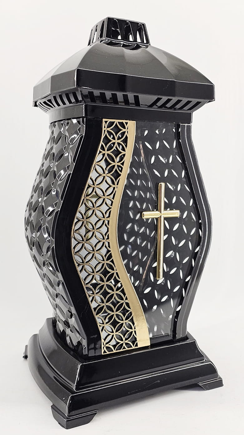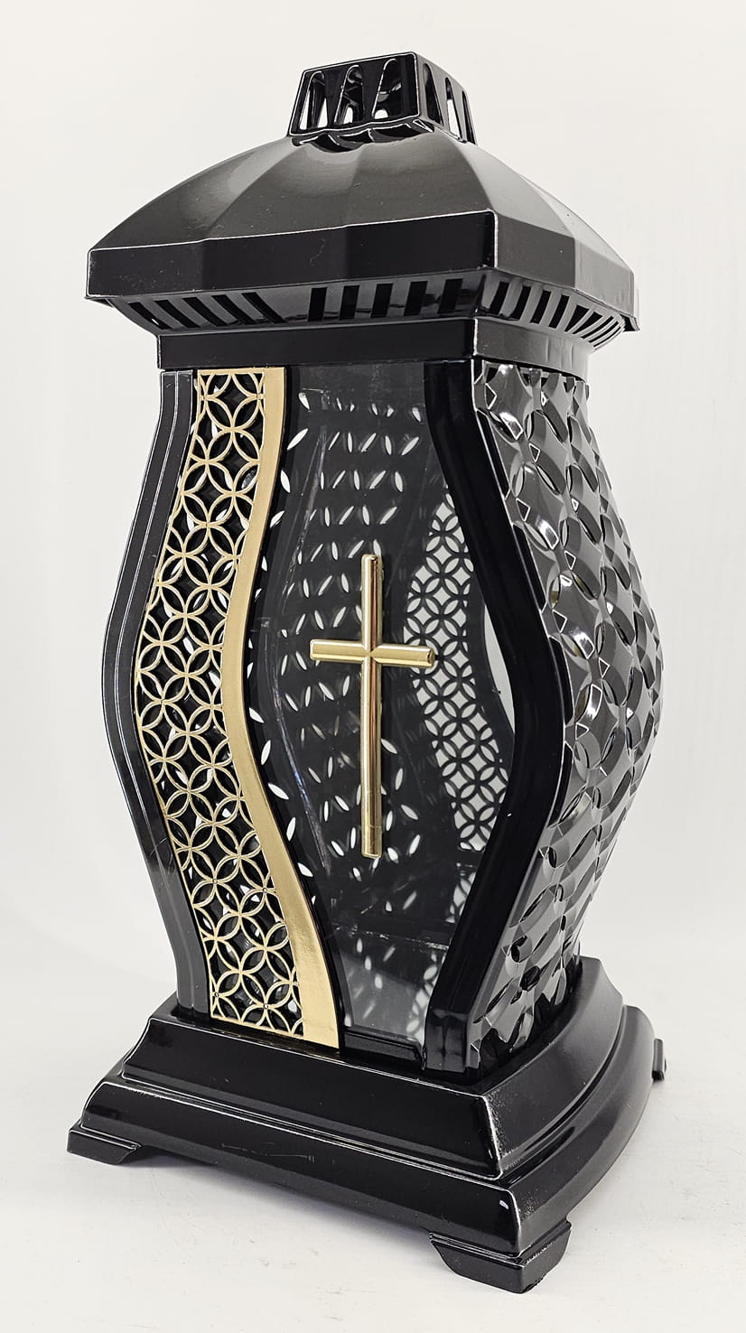 - kolor znicza: Czarny, szyba przezroczysta + tworzywo czarne lakierowane. Boki z tworzywa i szkła. Tył znicza to lustro. Pokrywa i podstawa z czarnego lakierowanego tworzywa