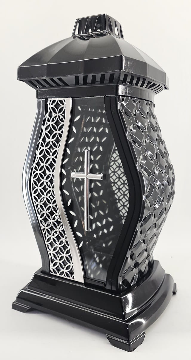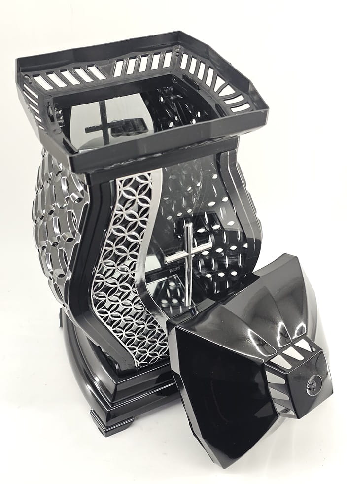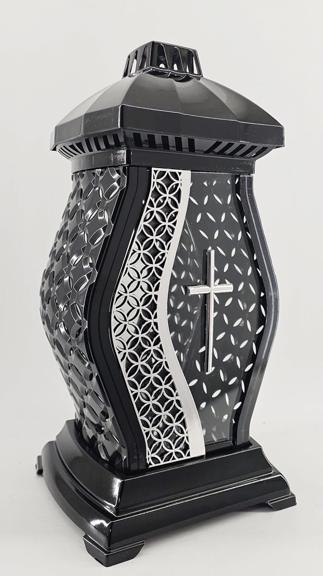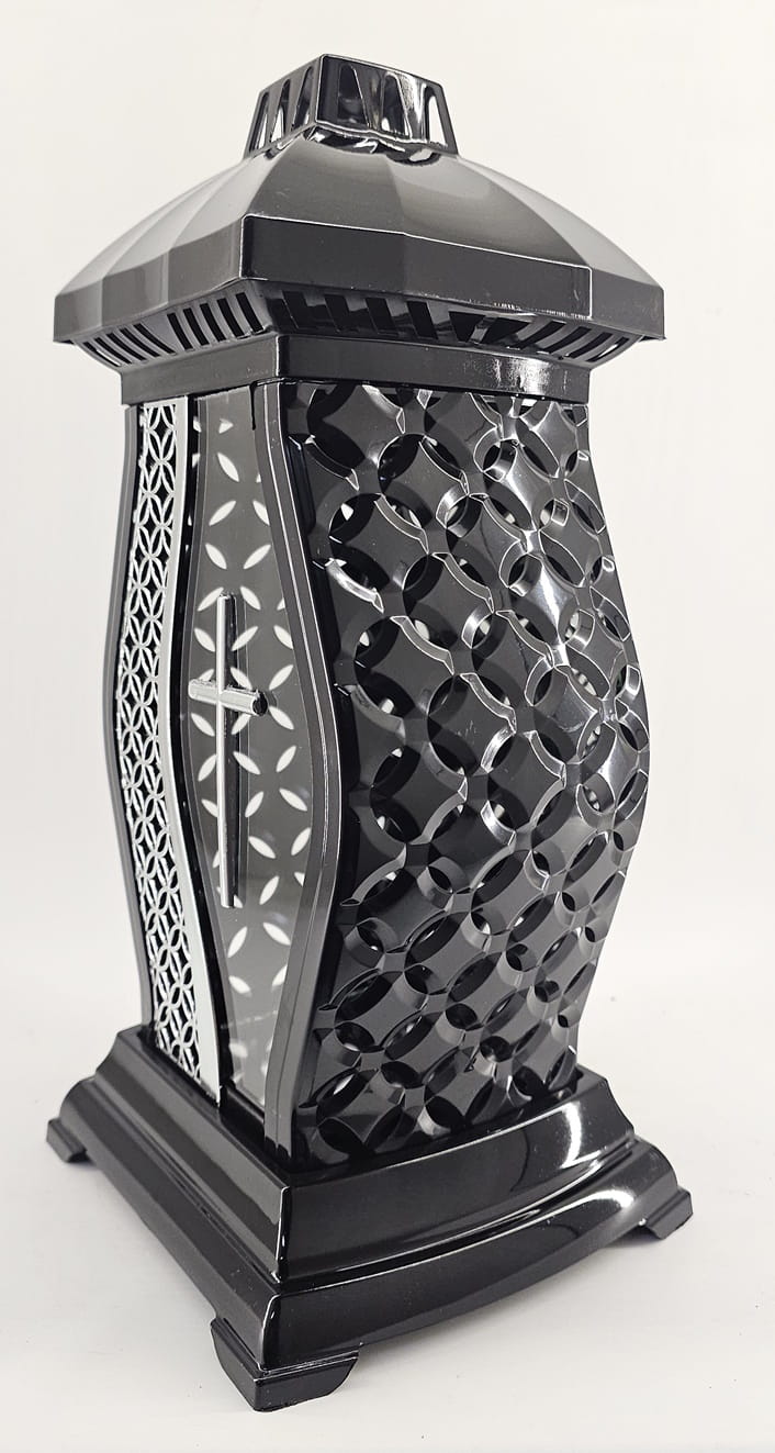 - kolor znicza: Czarny, szyba przezroczysta + tworzywo czarne lakierowane. Boki z tworzywa i szkła. Tył znicza to lustro. Pokrywa i podstawa z czarnego lakierowanego tworzywa