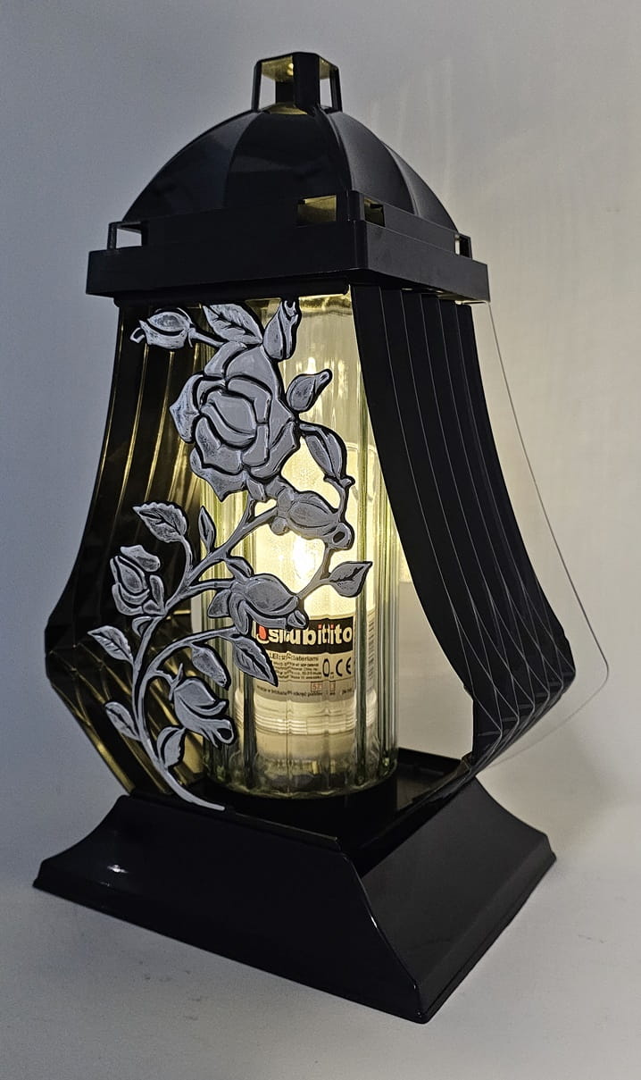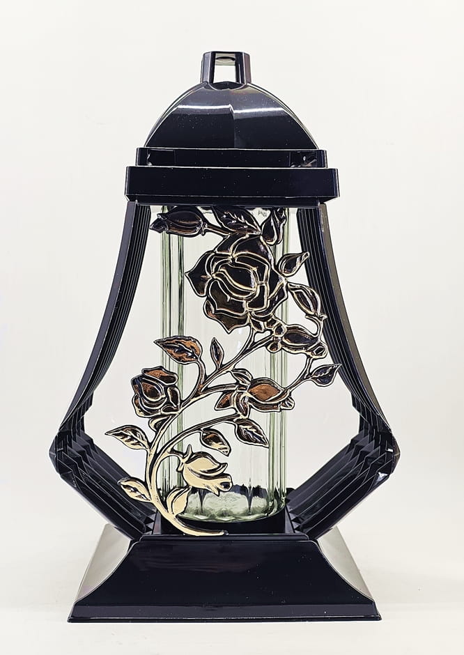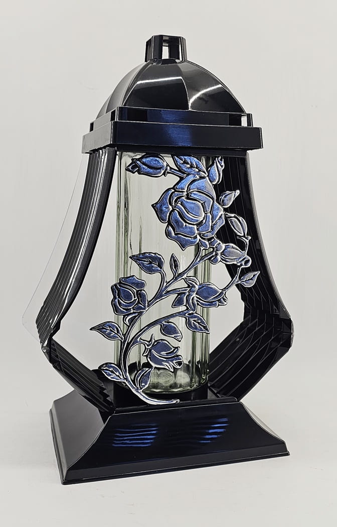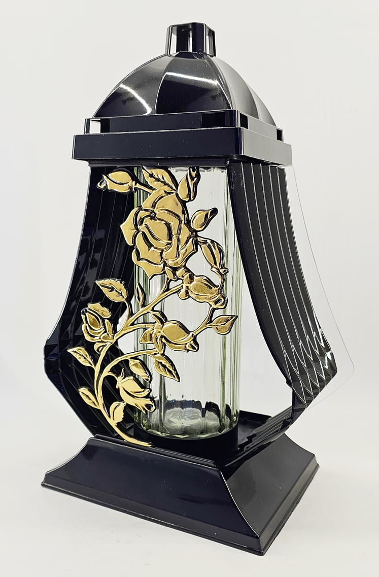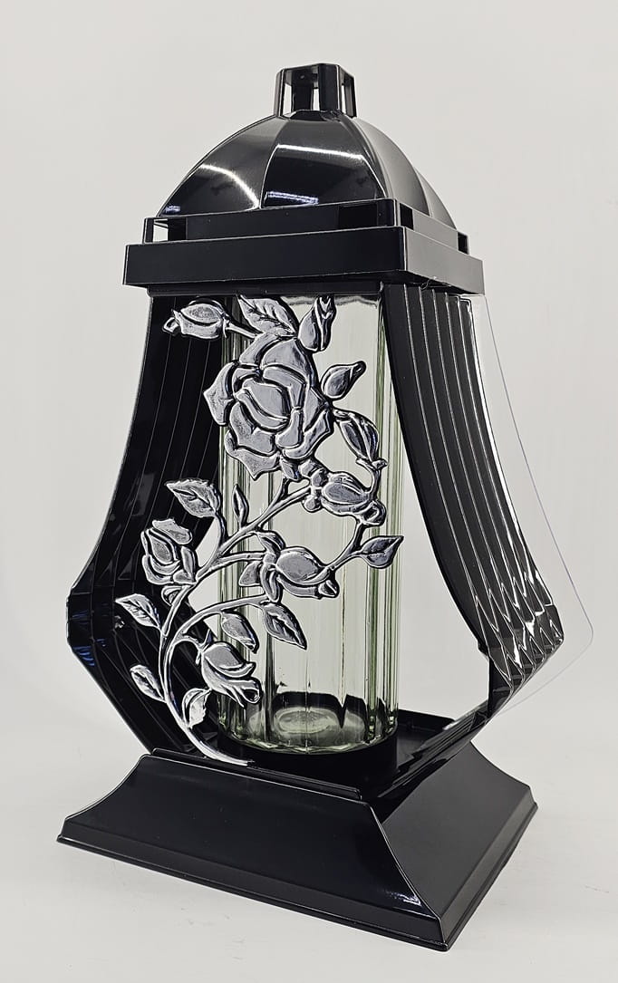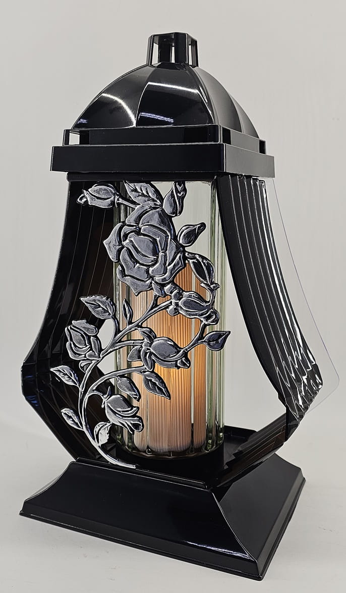 - kolor znicza: strona przednia ażur z motywem róży. Tył przeźroczysty, boczki z czarnego tworzywa, pokrywa i podstawa z tworzywa