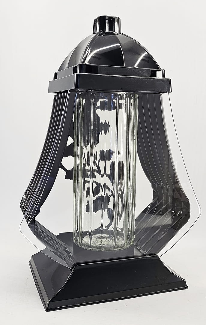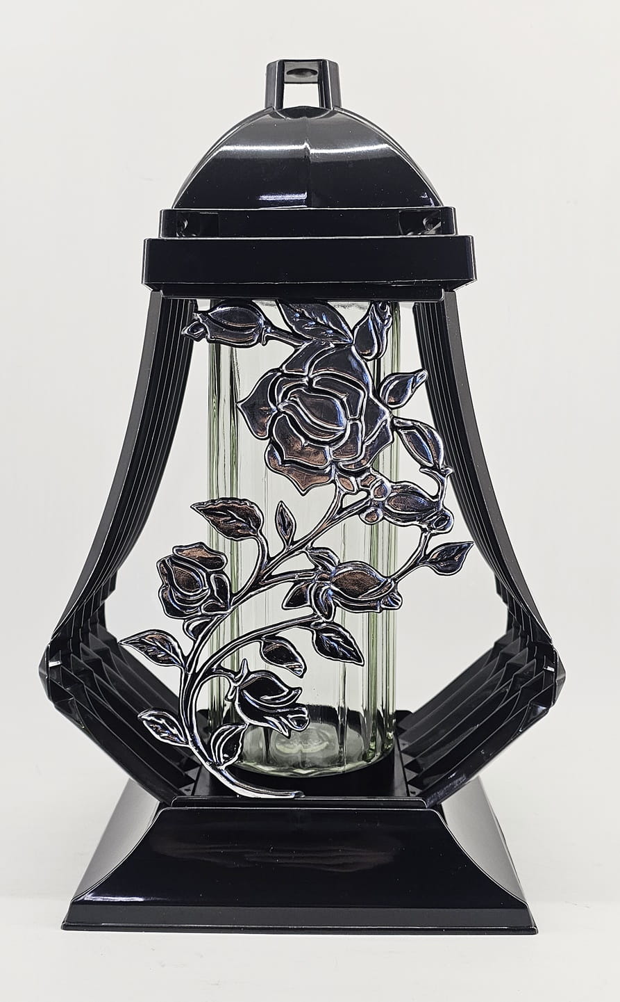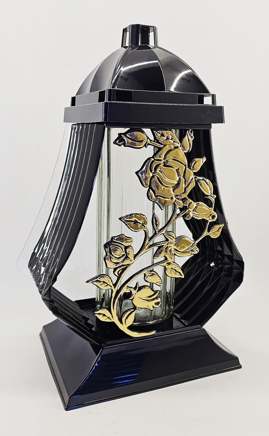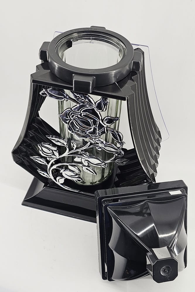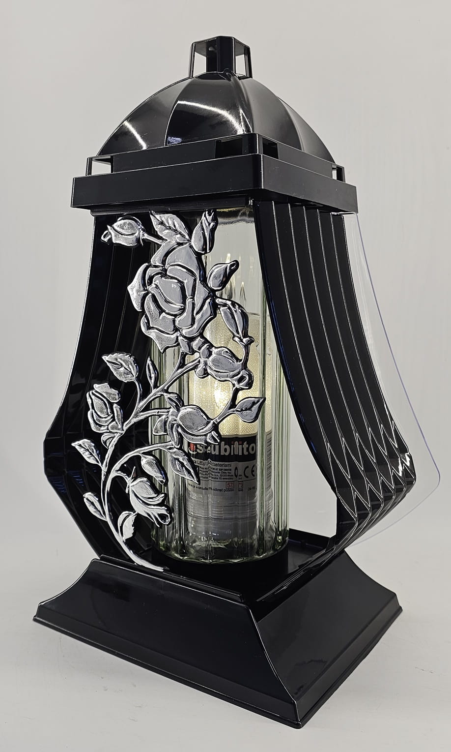 - kolor znicza: strona przednia ażur z motywem róży. Tył przeźroczysty, boczki z czarnego tworzywa, pokrywa i podstawa z tworzywa