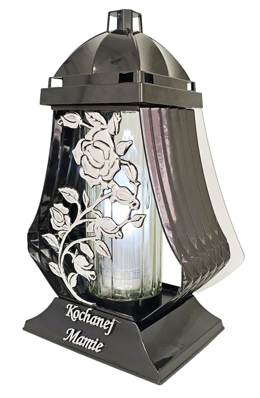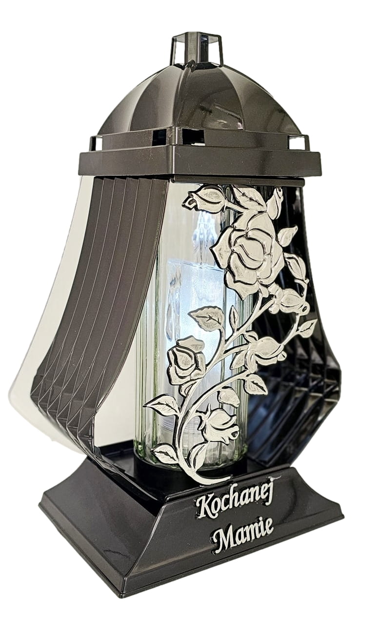 - kolor znicza: strona przednia ażur z motywem róży. Tył przeźroczysty, boczki z czarnego tworzywa, pokrywa i podstawa z tworzywa