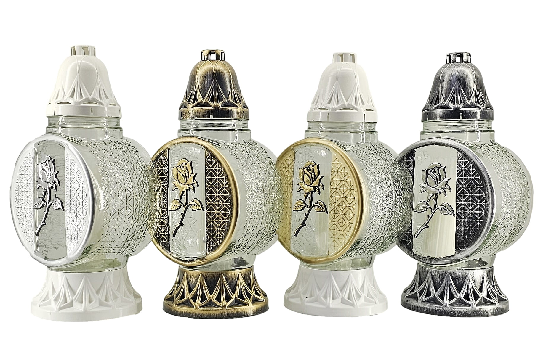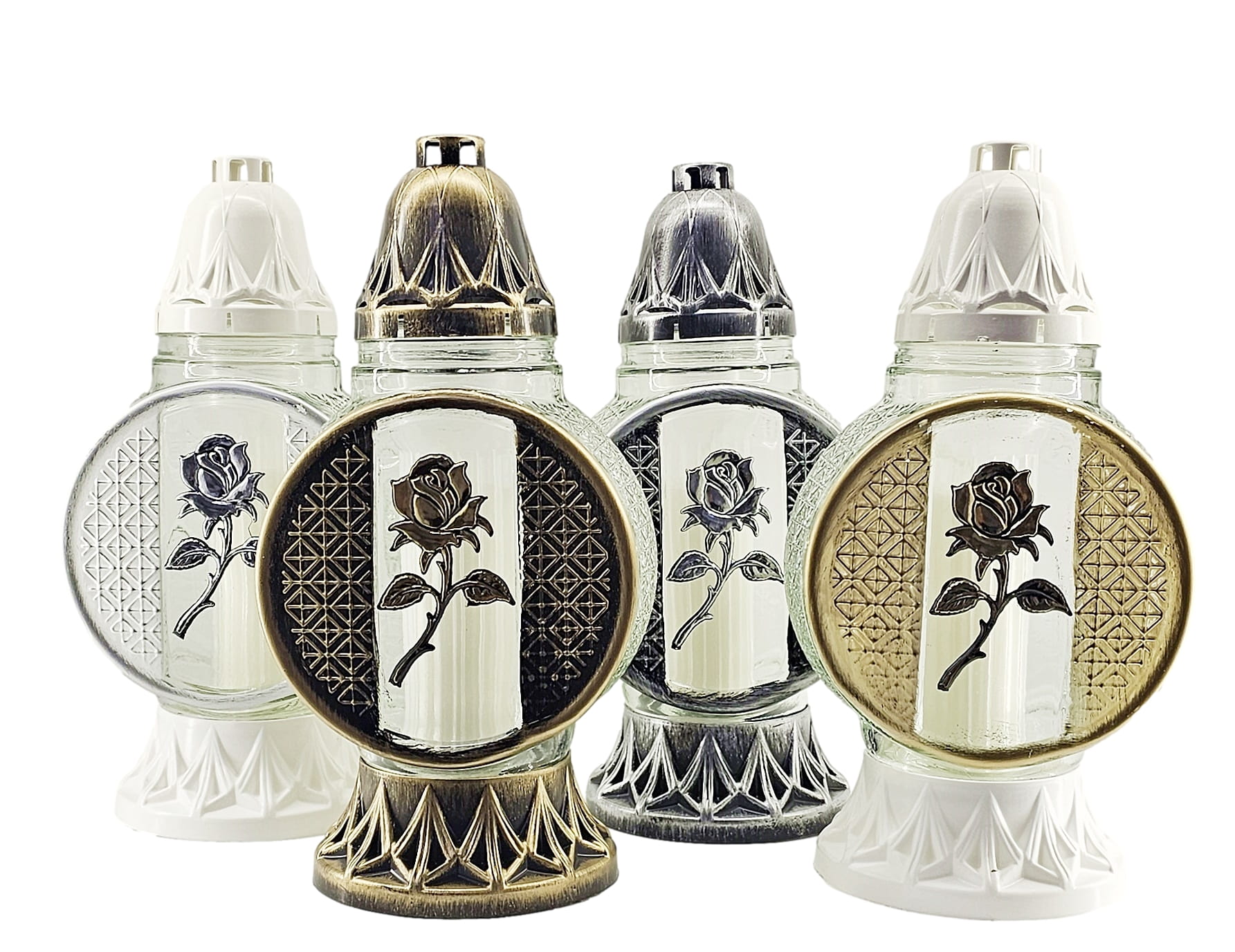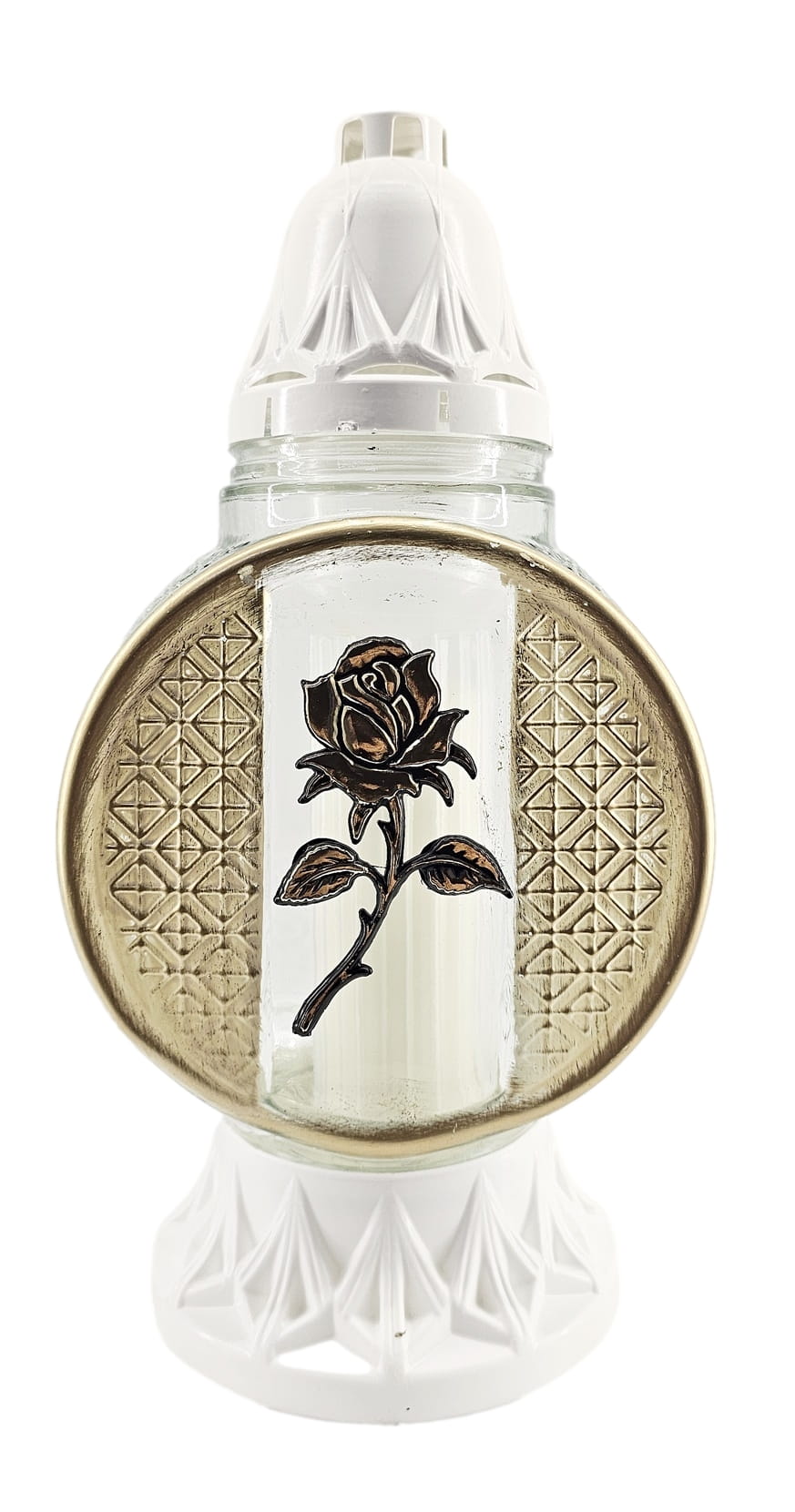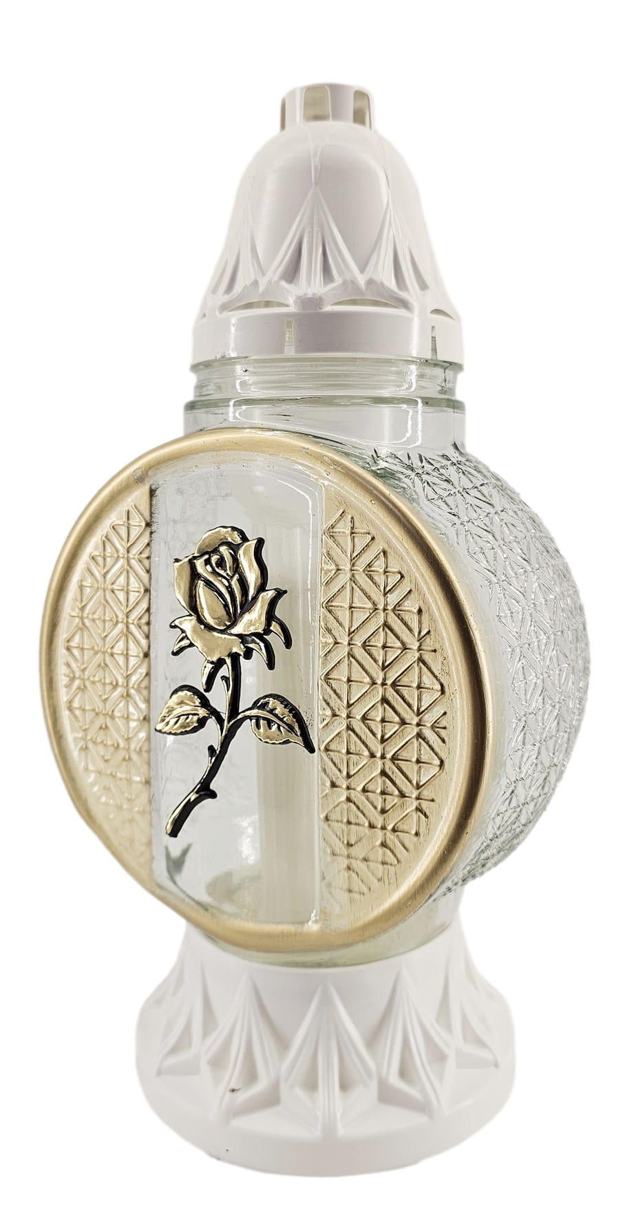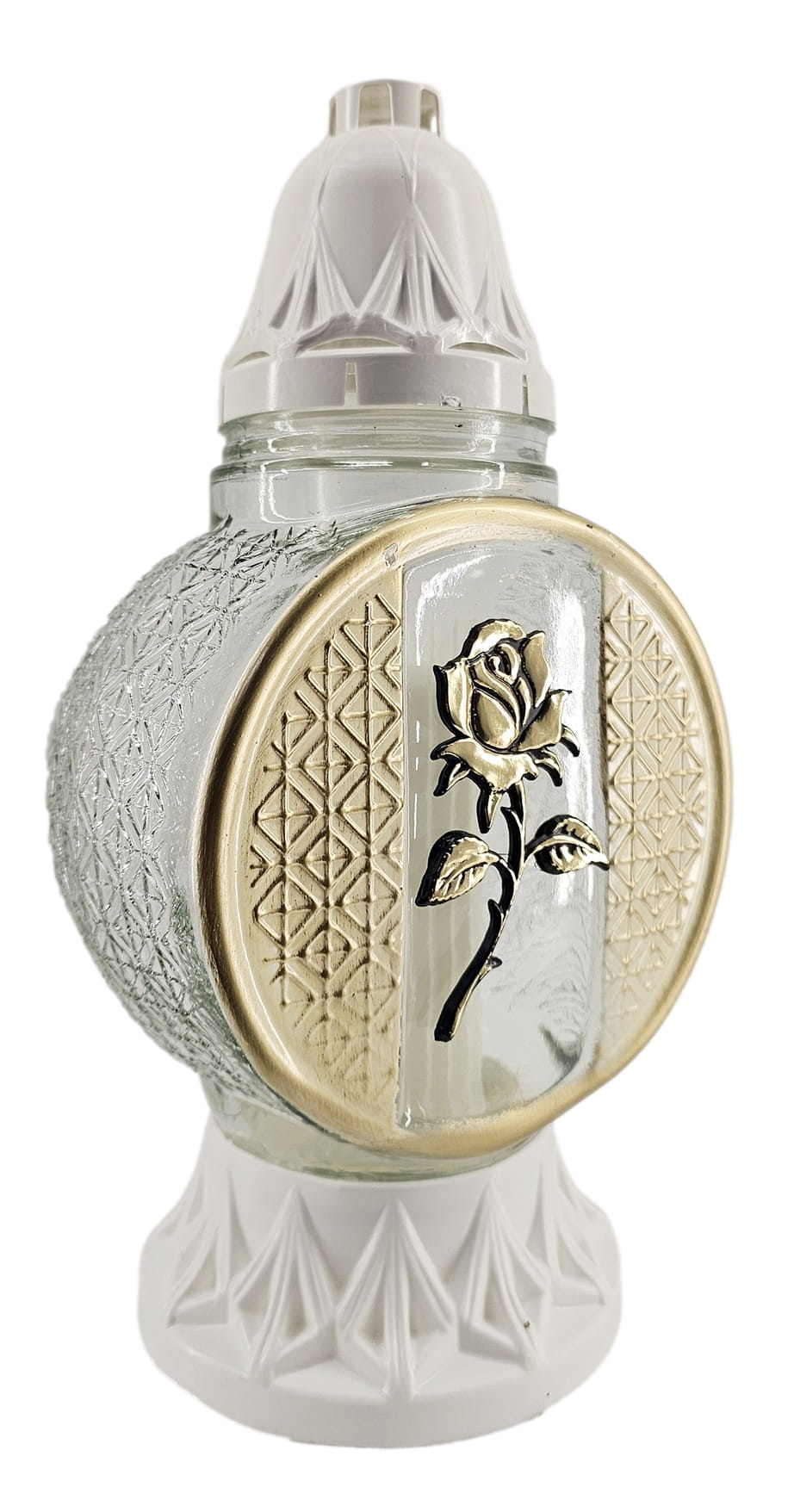 Znicz wykonany z mocnego szkła, ręcznie zdobiony z dekorem różą. Znicz odznacza się nowoczesnym kształtem oraz bardzo wysoką starannością wykonania - jest to produkt ręcznie zdobiony, wykonany w Polsce.