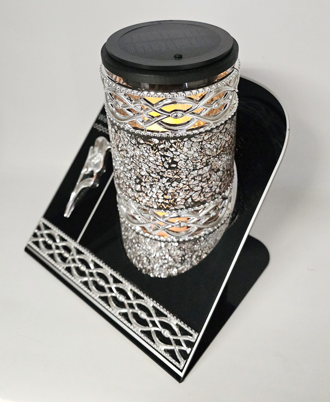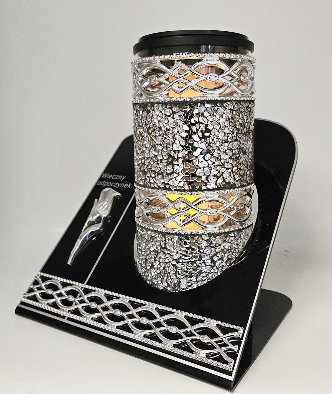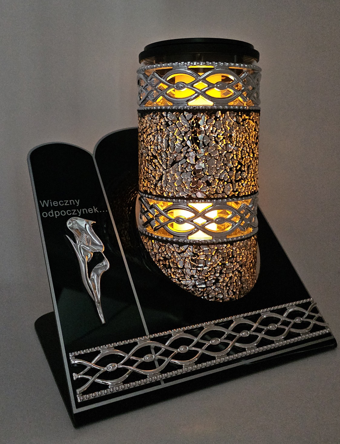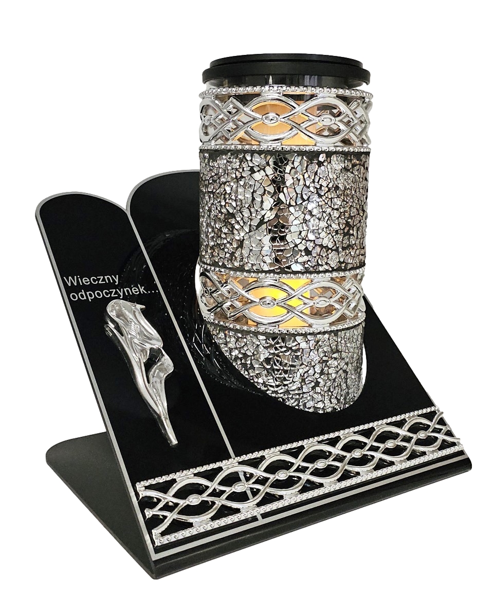 - kolor znicza: Srebrny+ srebrny dekor. Podstawa z giętego akrylu, pokrywa z panelem solarnym