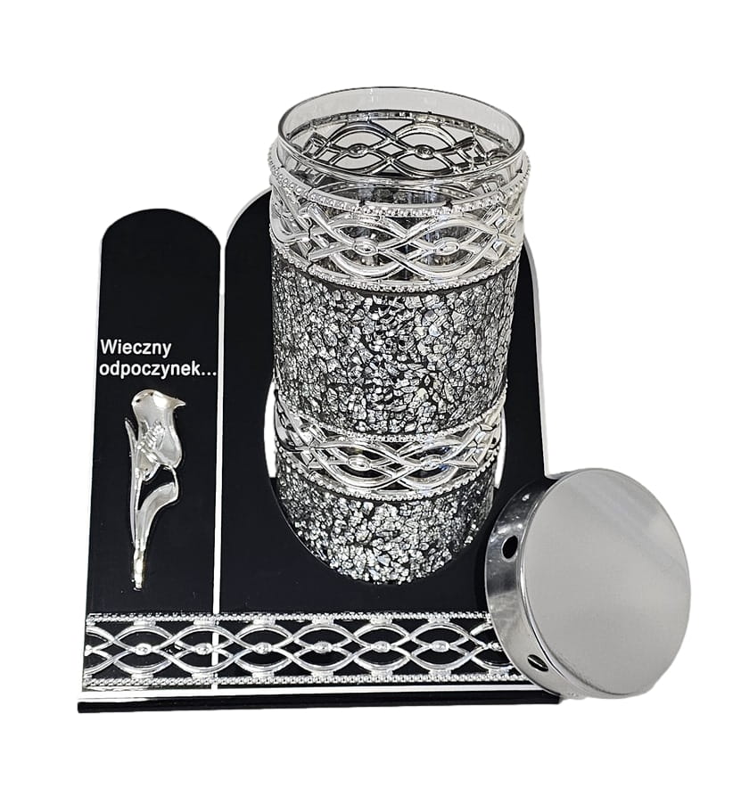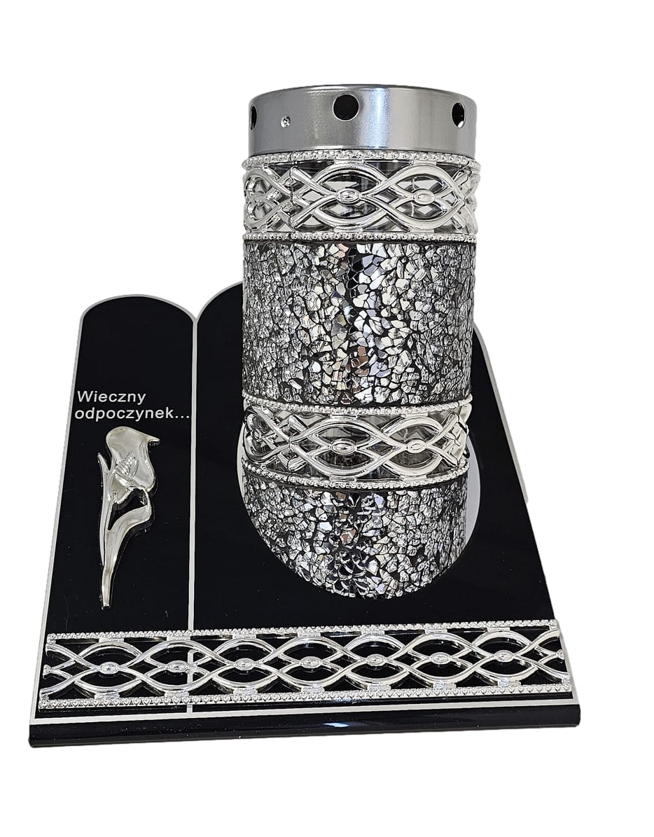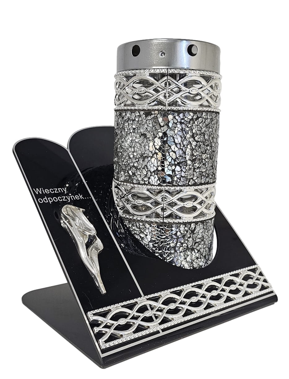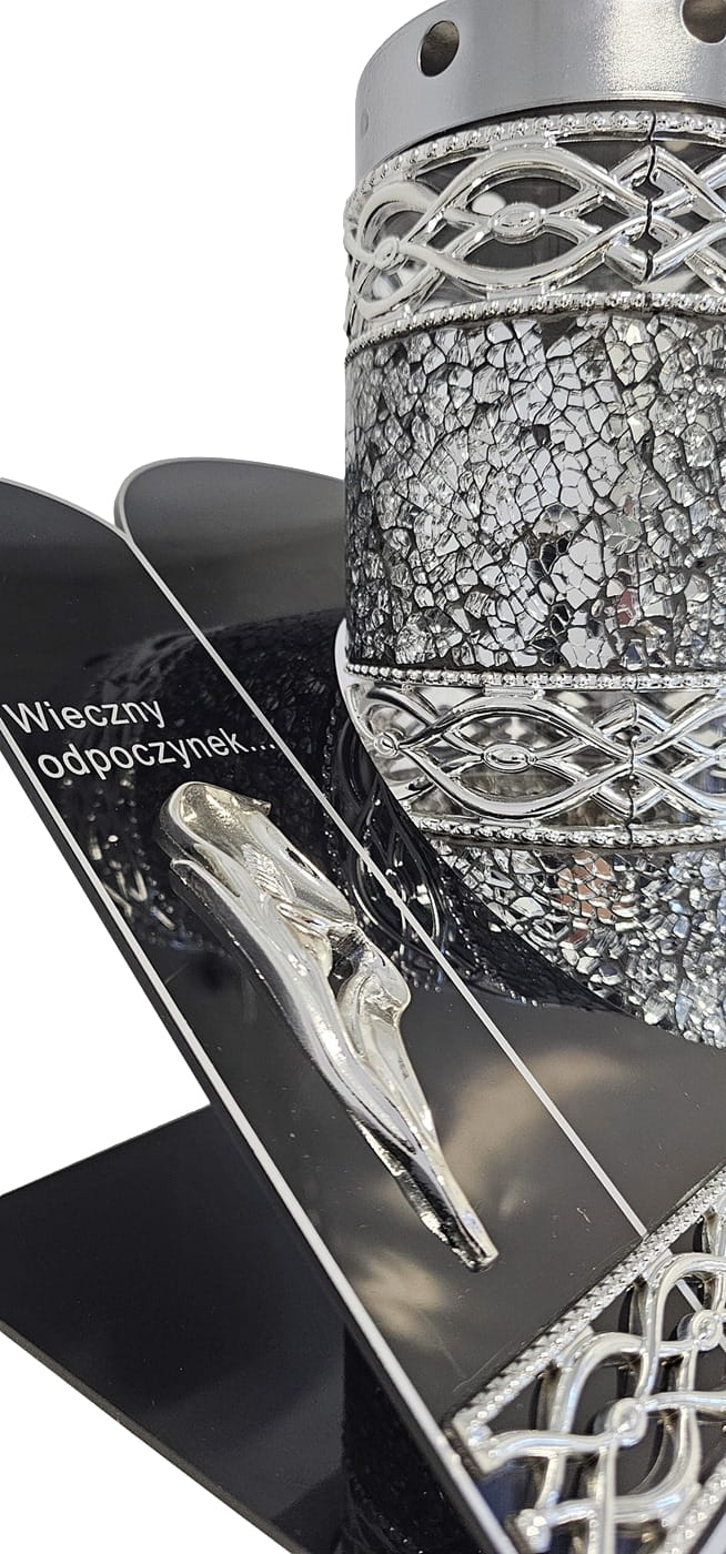 - kolor znicza: Srebrny+ srebrny dekor. Podstawa z giętego akrylu, pokrywa metalowa