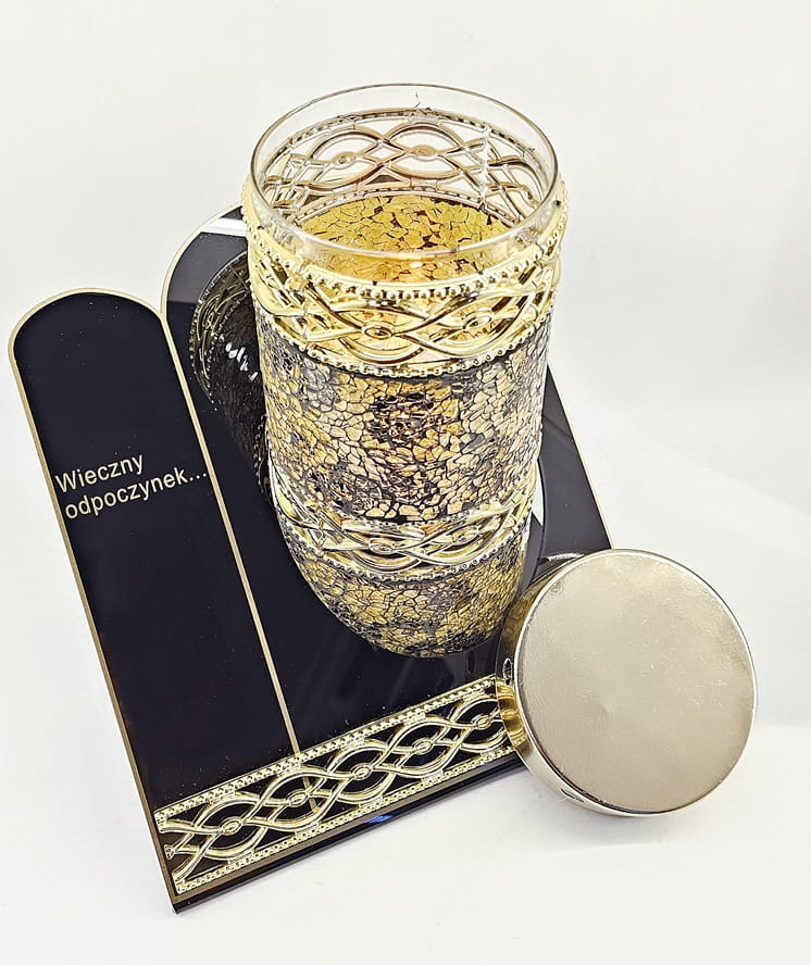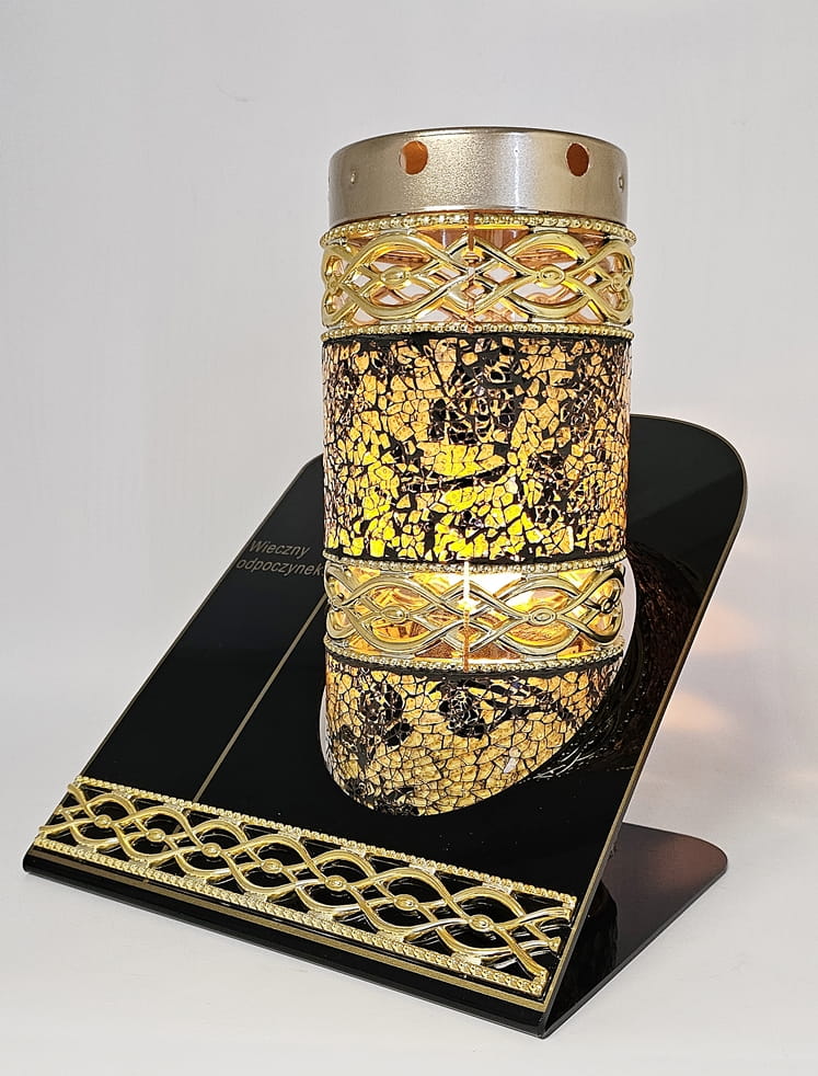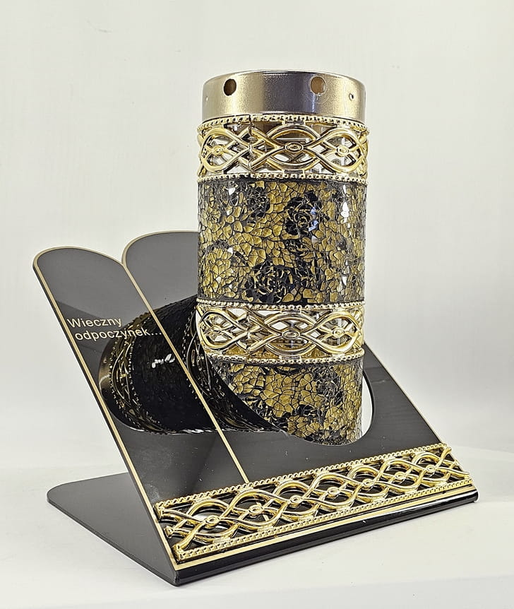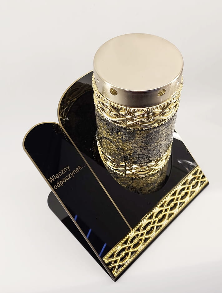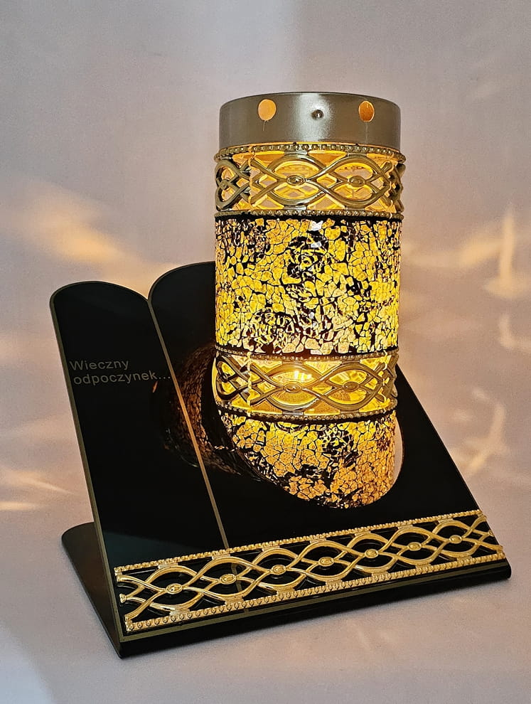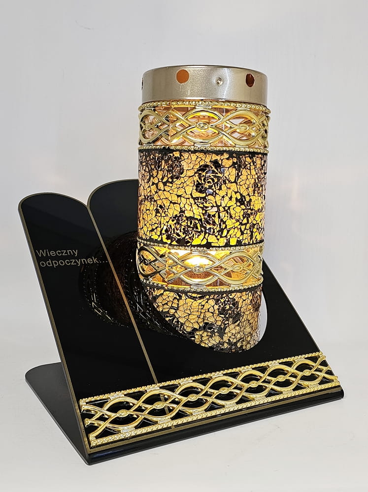 - kolor znicza: Złoto czarny+ złoty dekor. Podstawa z giętego akrylu, pokrywa metalowa