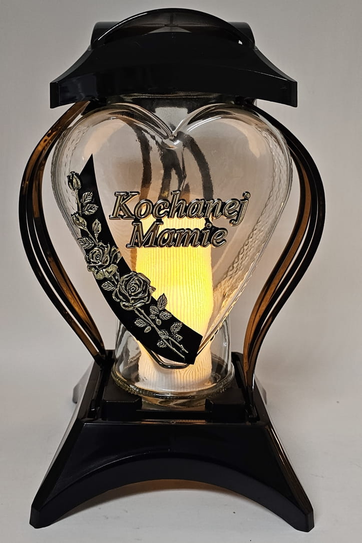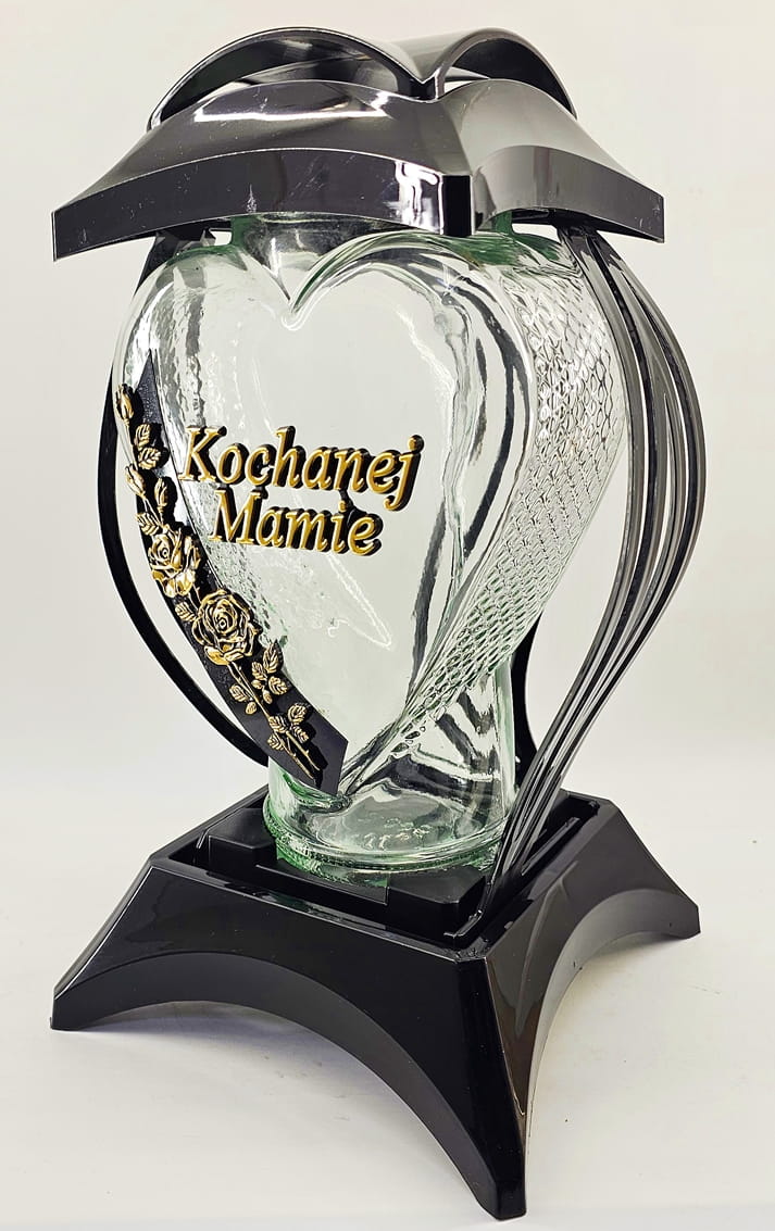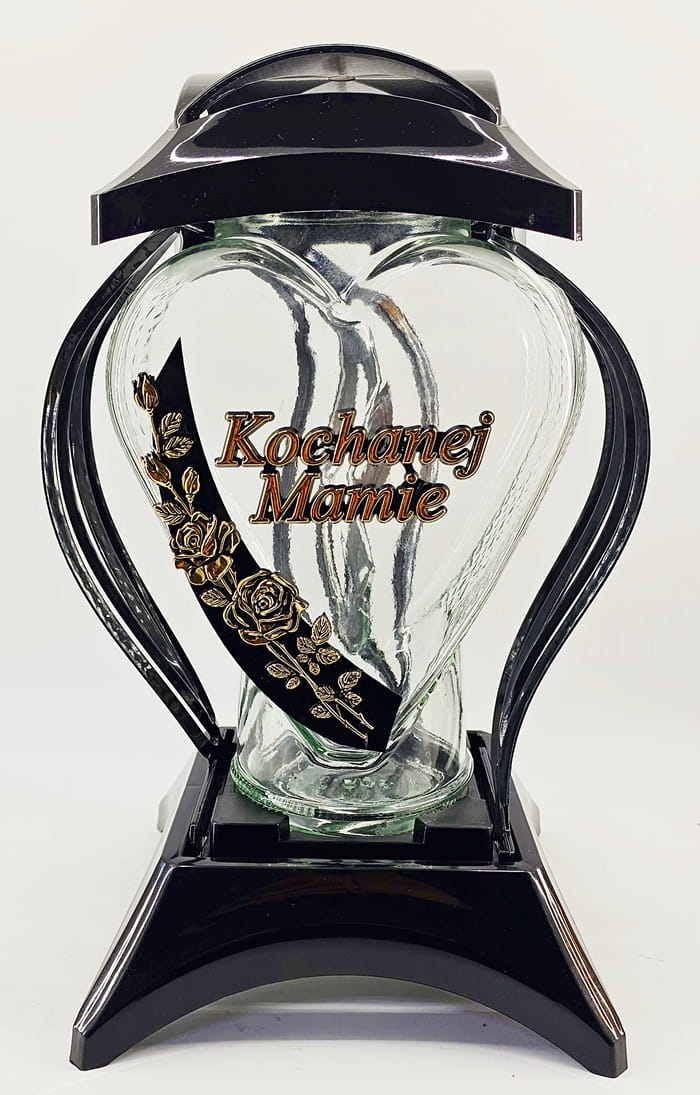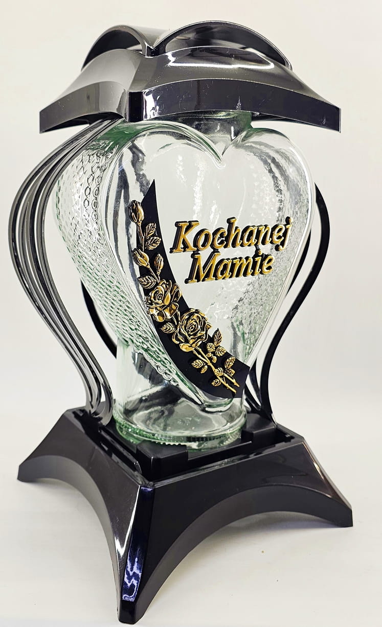 - kolor znicza: Czarny ze złotymi zdobieniami. Pokrywa i podstawa z czarnego lakierowanego tworzywa