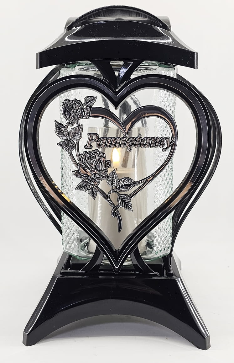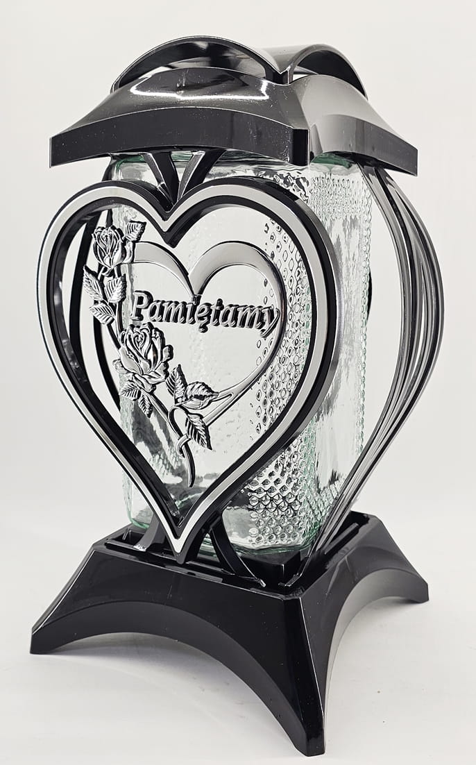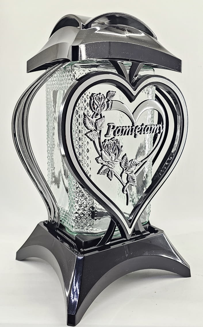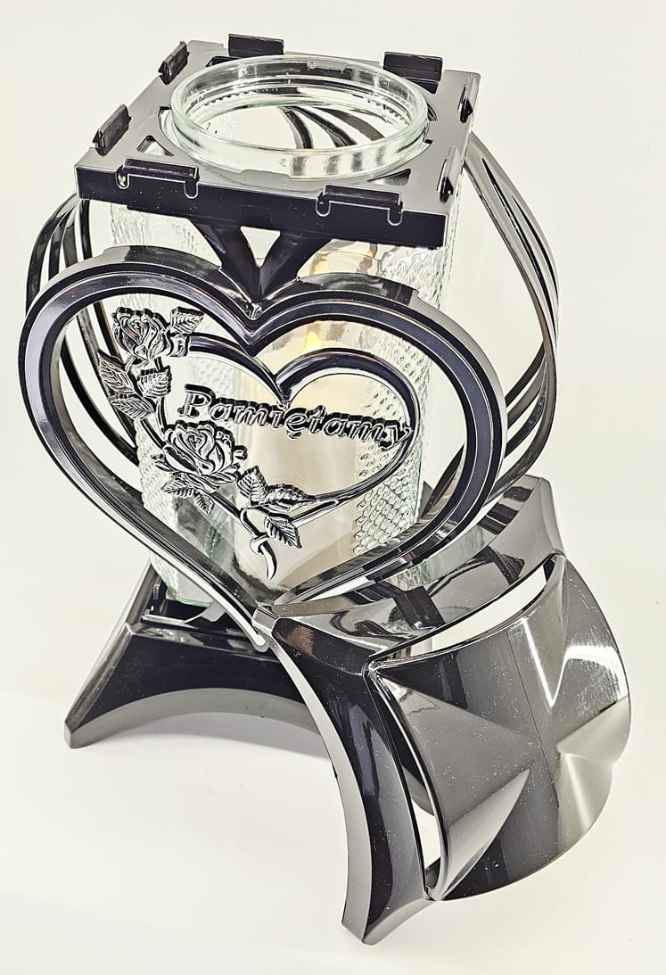 • kolor znicza: Czarny ze srebrnymi zdobieniami. Pokrywa i podstawa z czarnego lakierowanego tworzywa