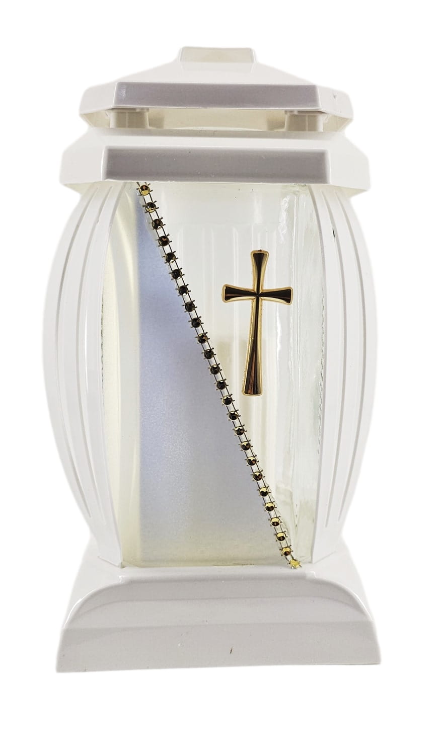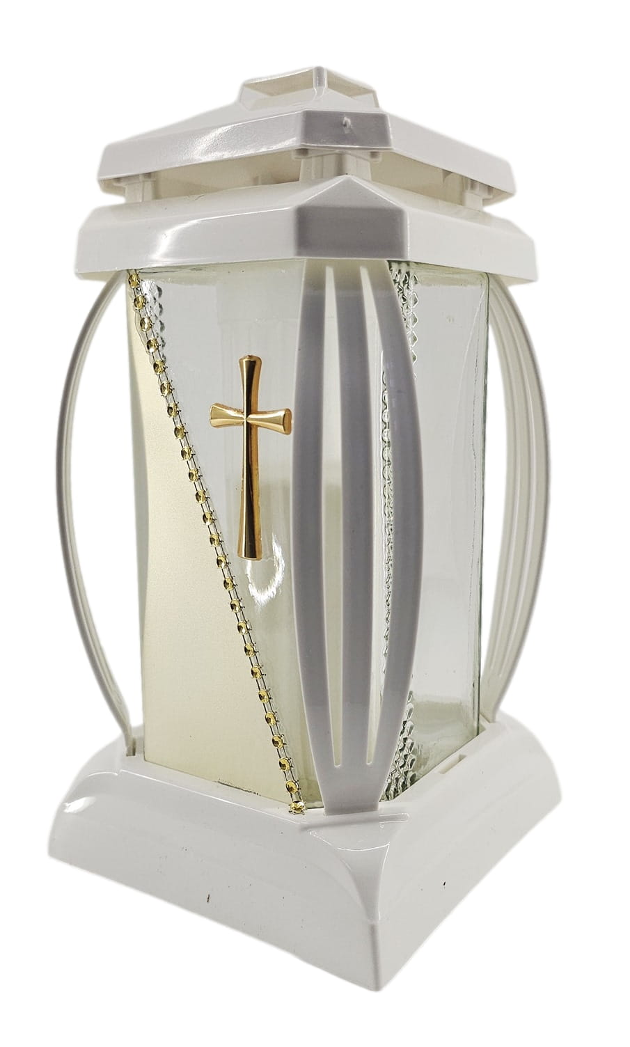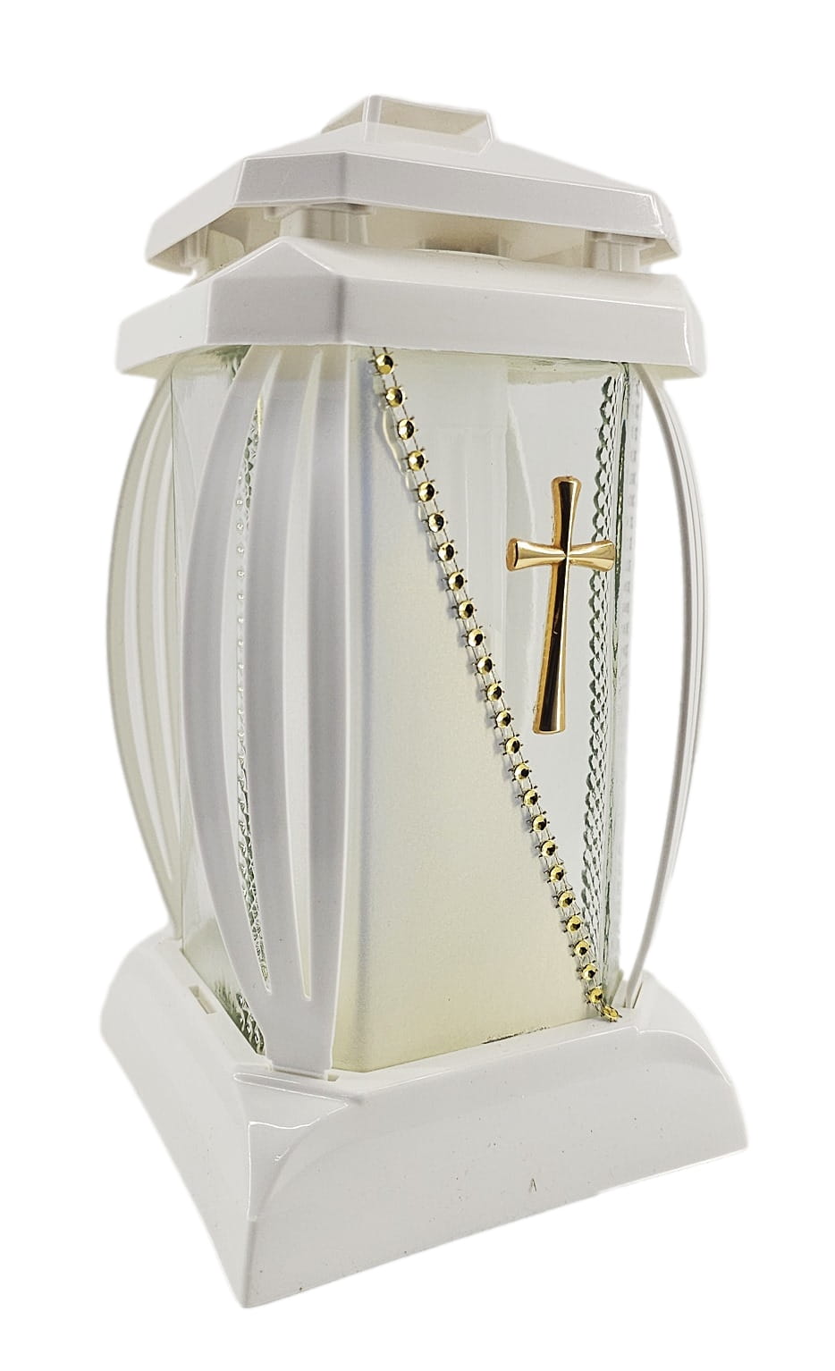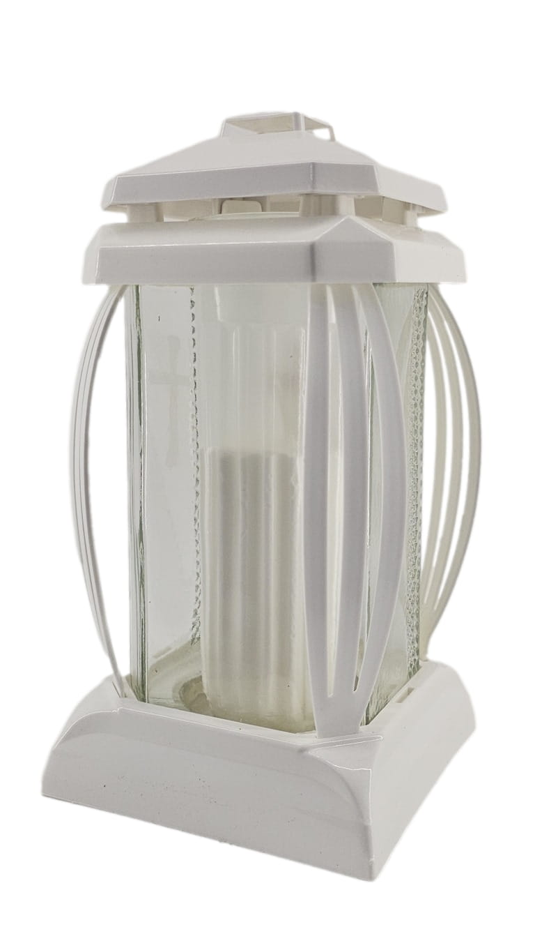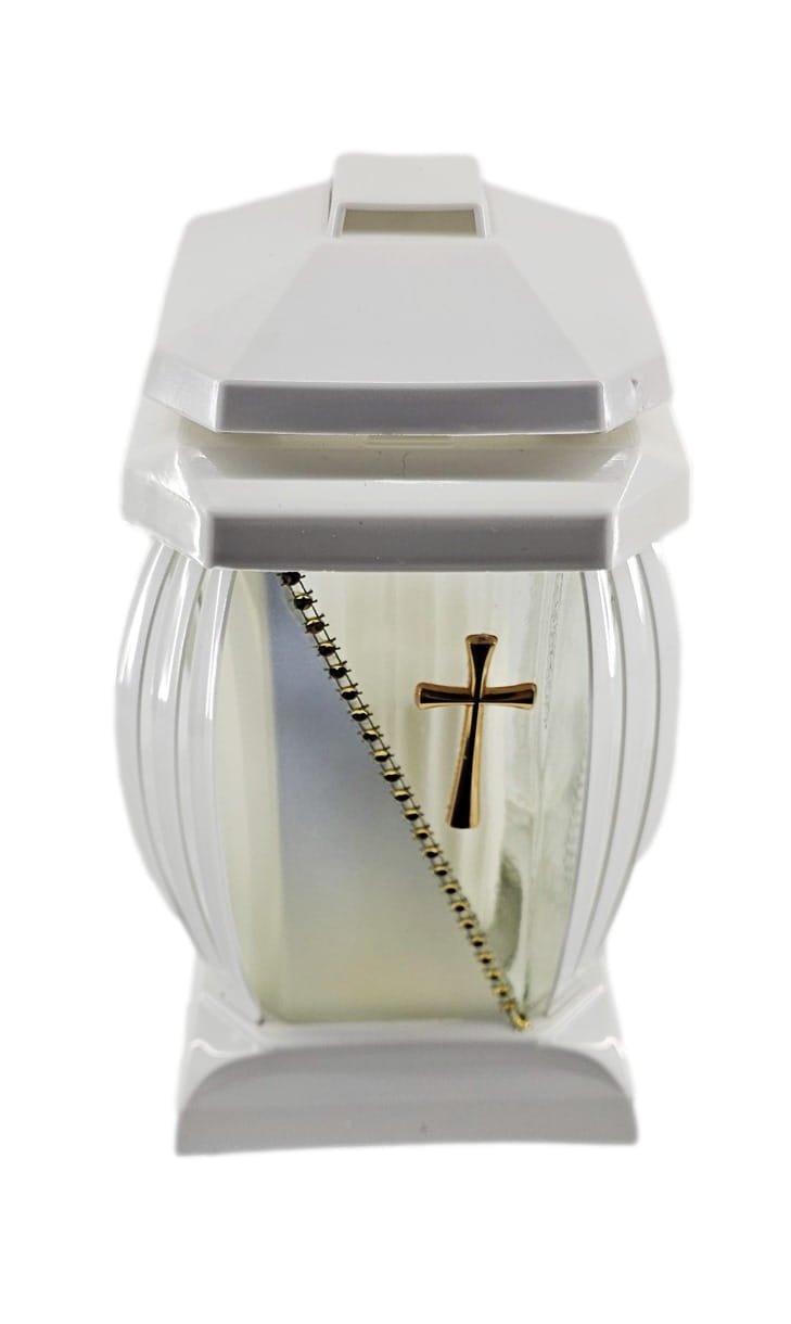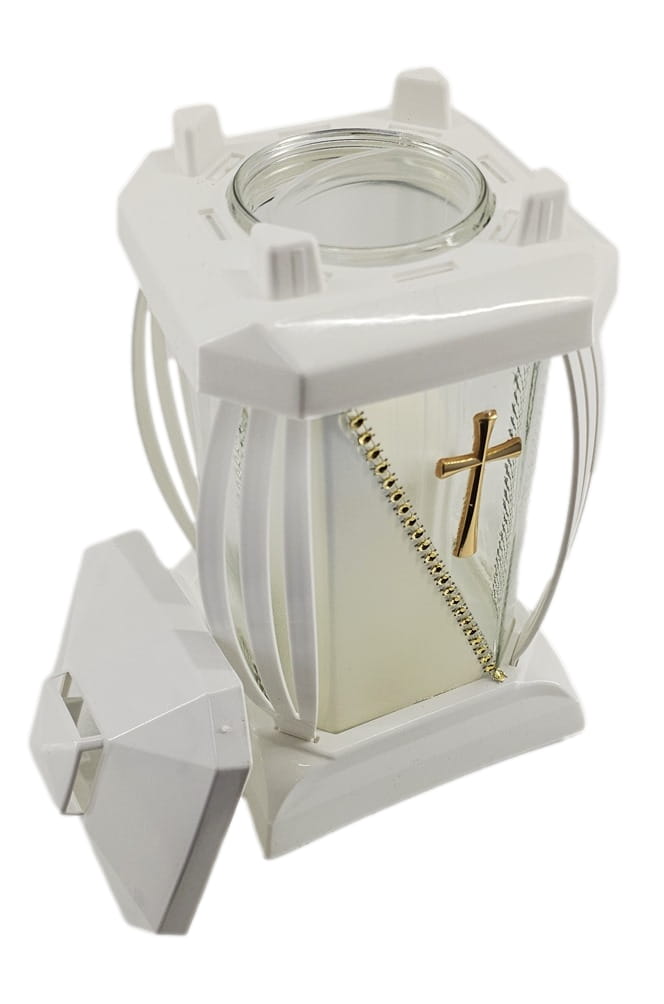 - kolor znicza: Biały, szkło przezroczyste + tworzywo białe. Boki z ażurowego tworzywa. Pokrywa i podstawa z białego tworzywa