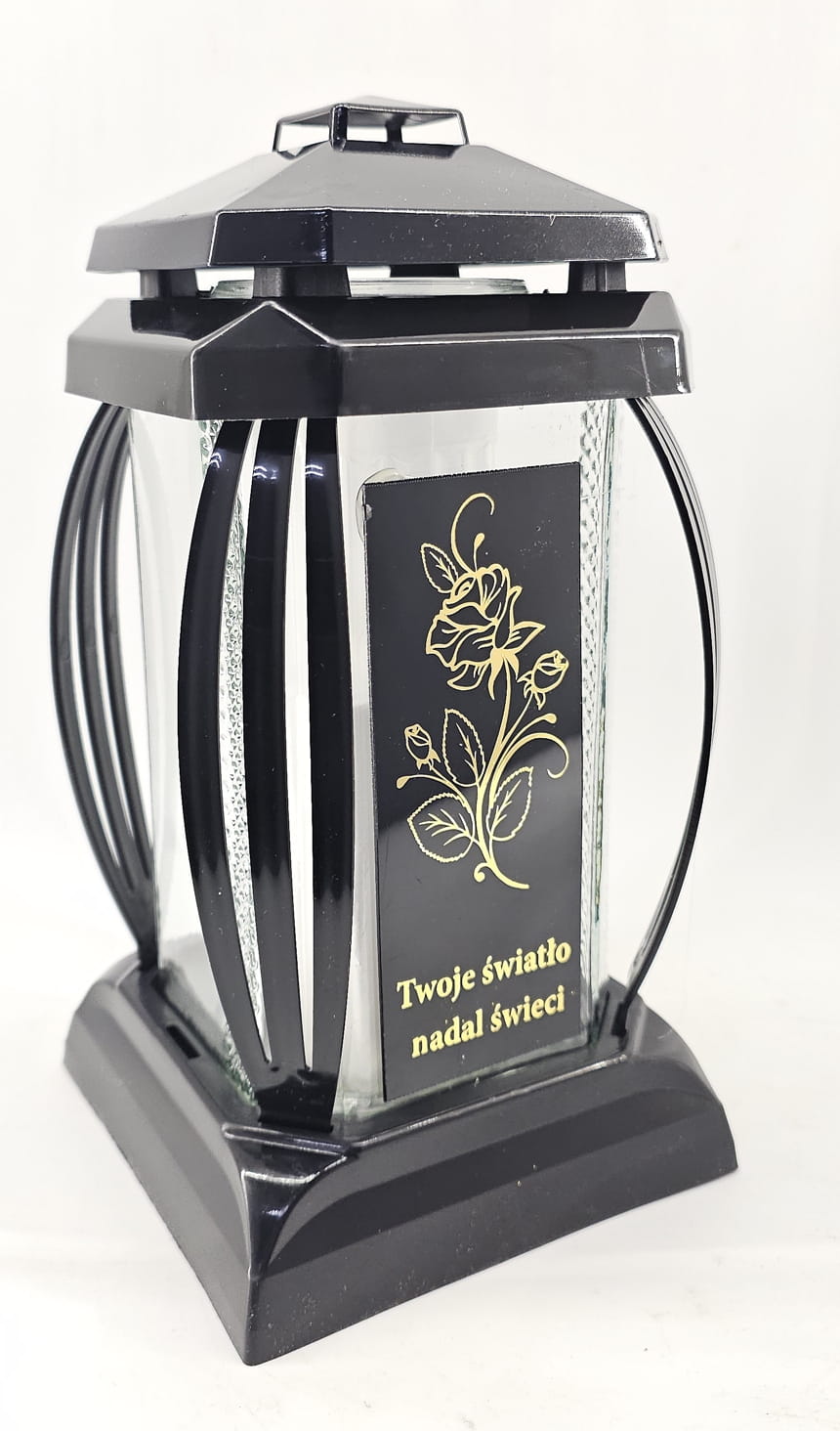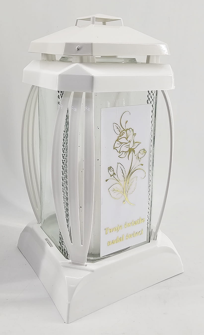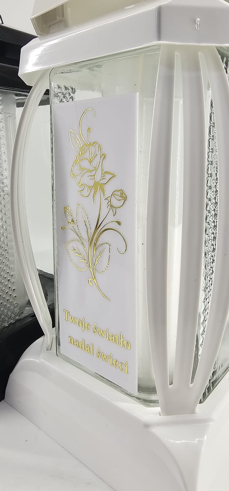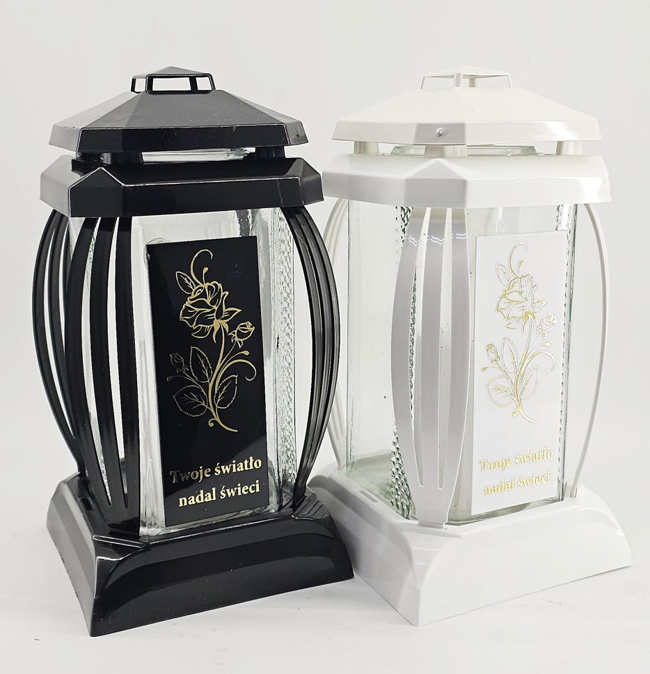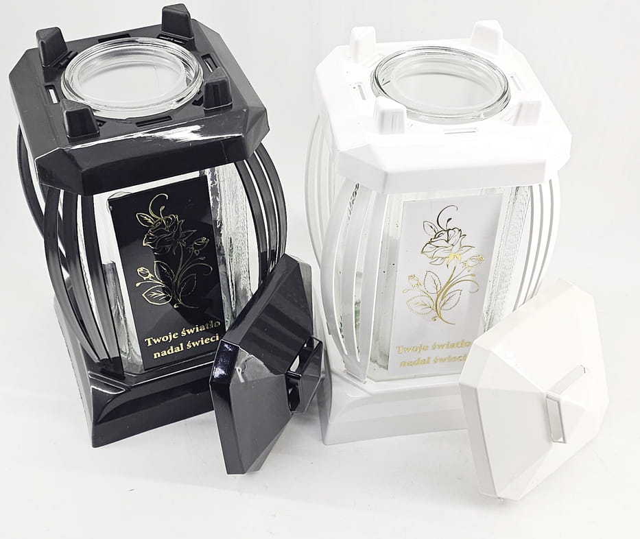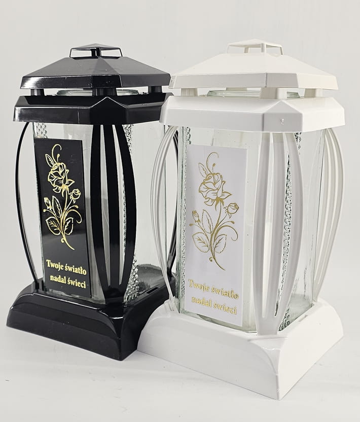 - kolor znicza: Biały / czarny, szkło przezroczyste + tworzywo białe/czarne. Boki z ażurowego tworzywa. Pokrywa i podstawa z białego/czarnego tworzywa