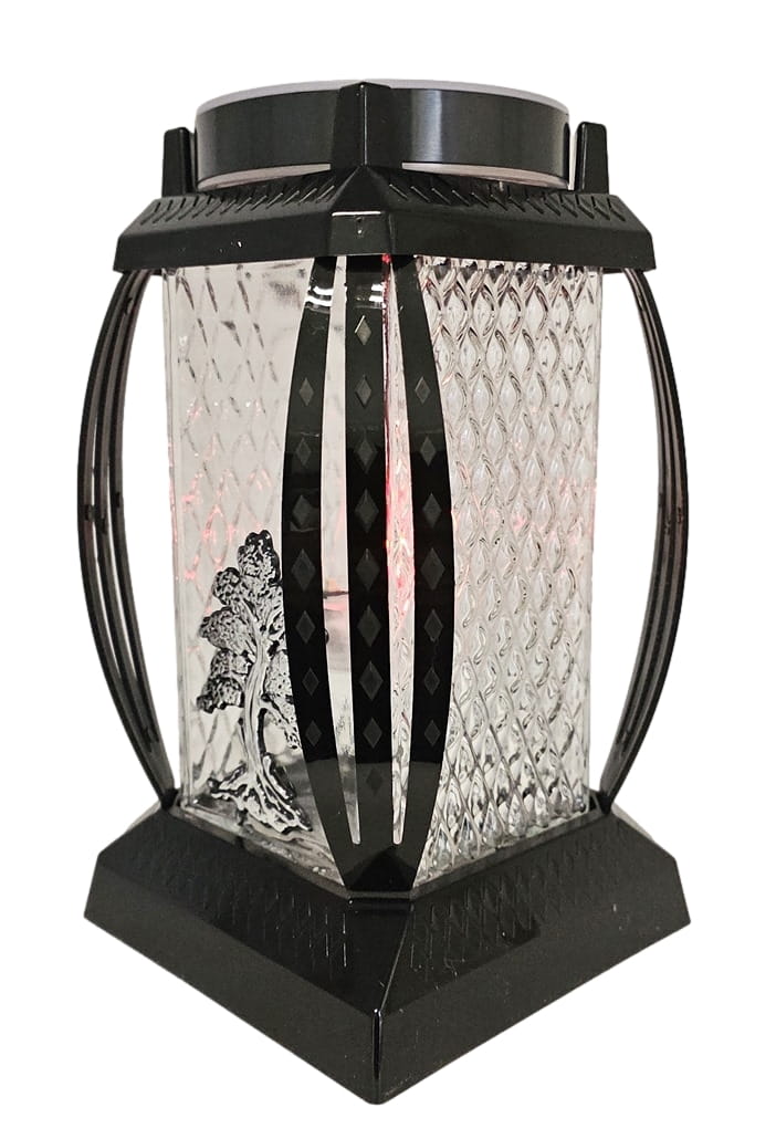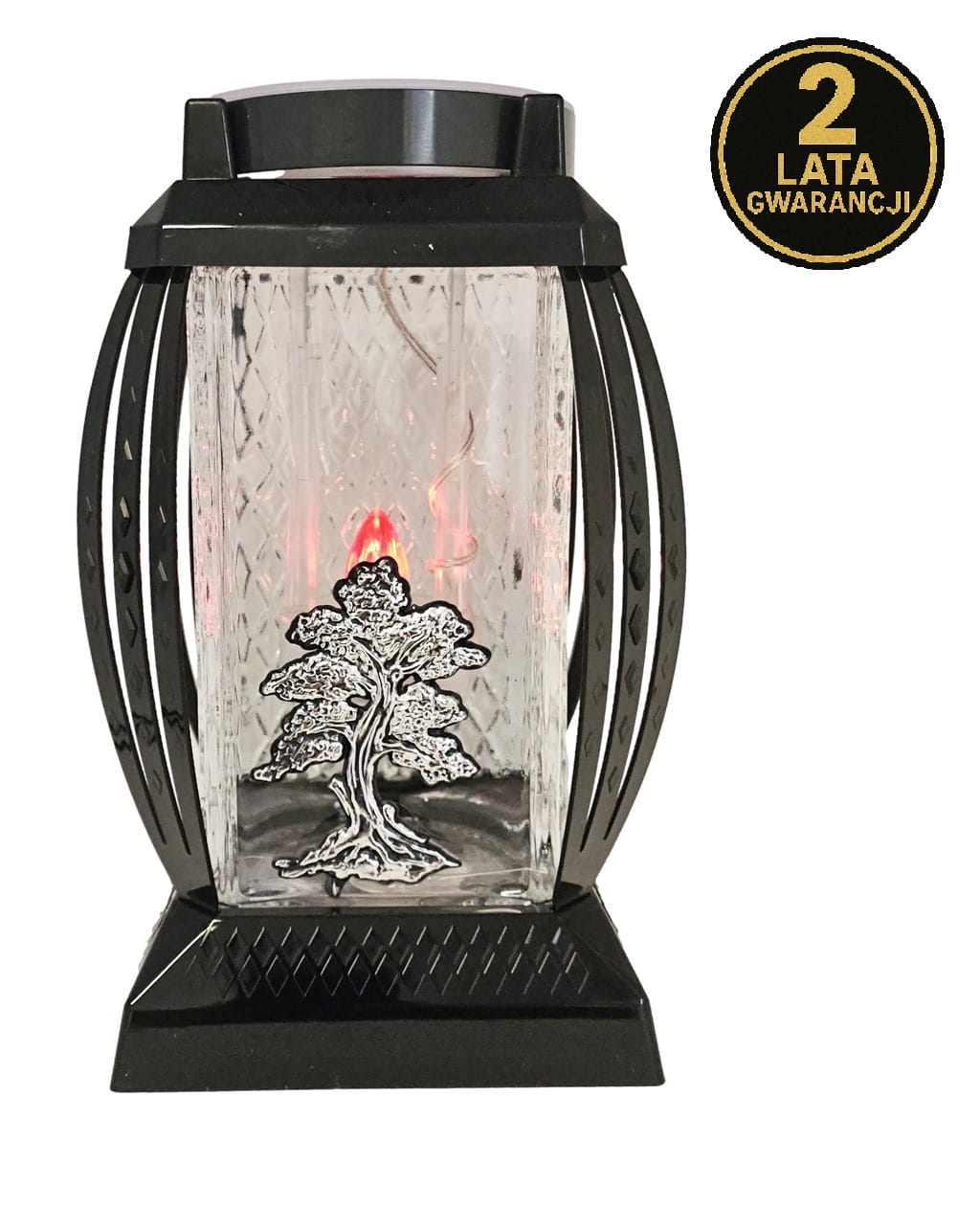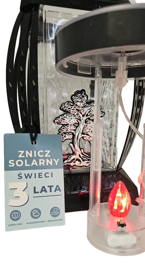 - W przykrywce znicza znajduje się panel fotowoltaiczny, który zasila czerwoną migającą diodę LED wkładu znajdującego się wewnątrz.