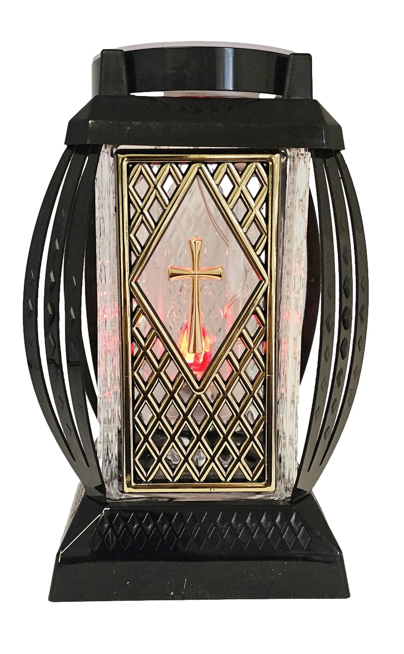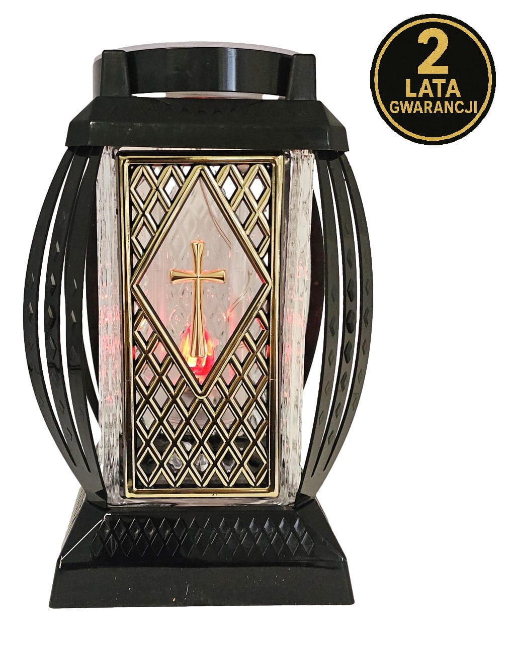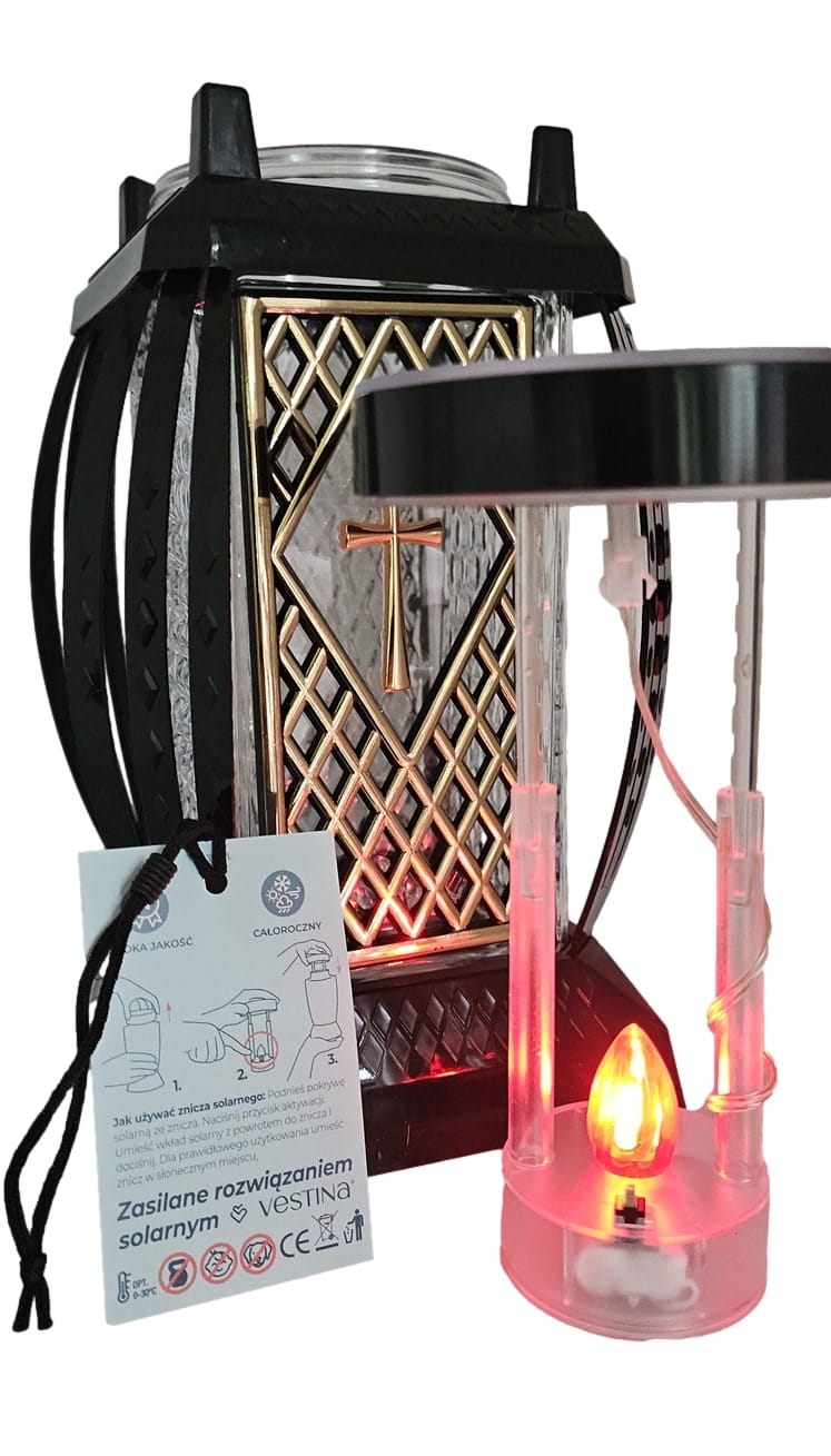 - W przykrywce znicza znajduje się panel fotowoltaiczny, który zasila czerwoną migającą diodę LED wkładu znajdującego się wewnątrz.