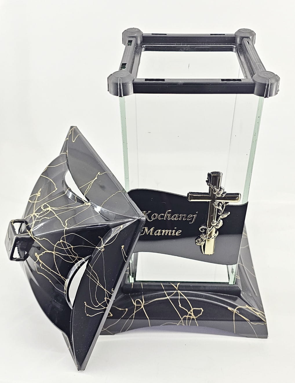 Elegancki znicz wykonany ze szkła, podstawa i kaptur wykonane z tworzywa.