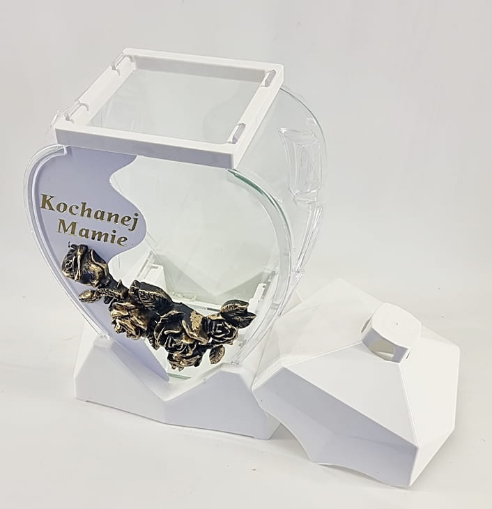 - kolor znicza: Biały, 2 x szyba przezroczysta + tworzywo białe. Boki z tworzywa. Pokrywa i podstawa z czarnego lakierowanego tworzywa