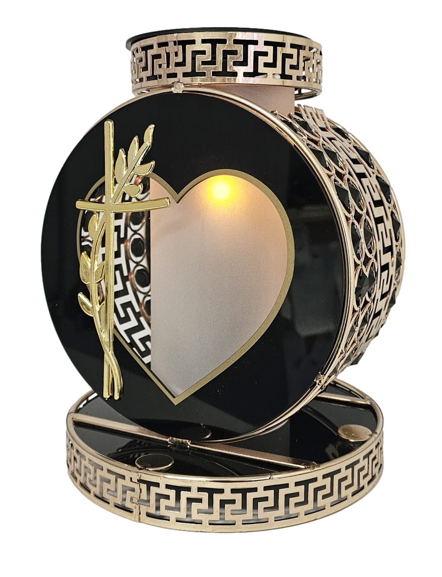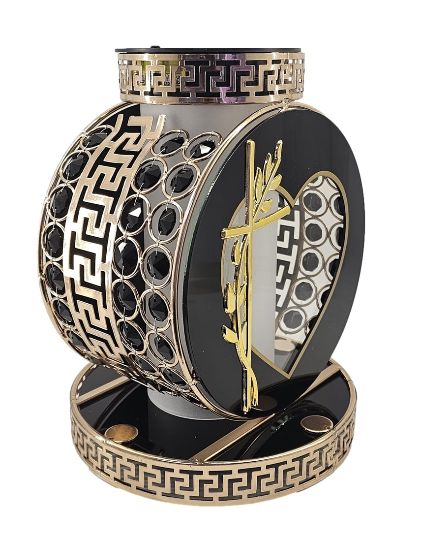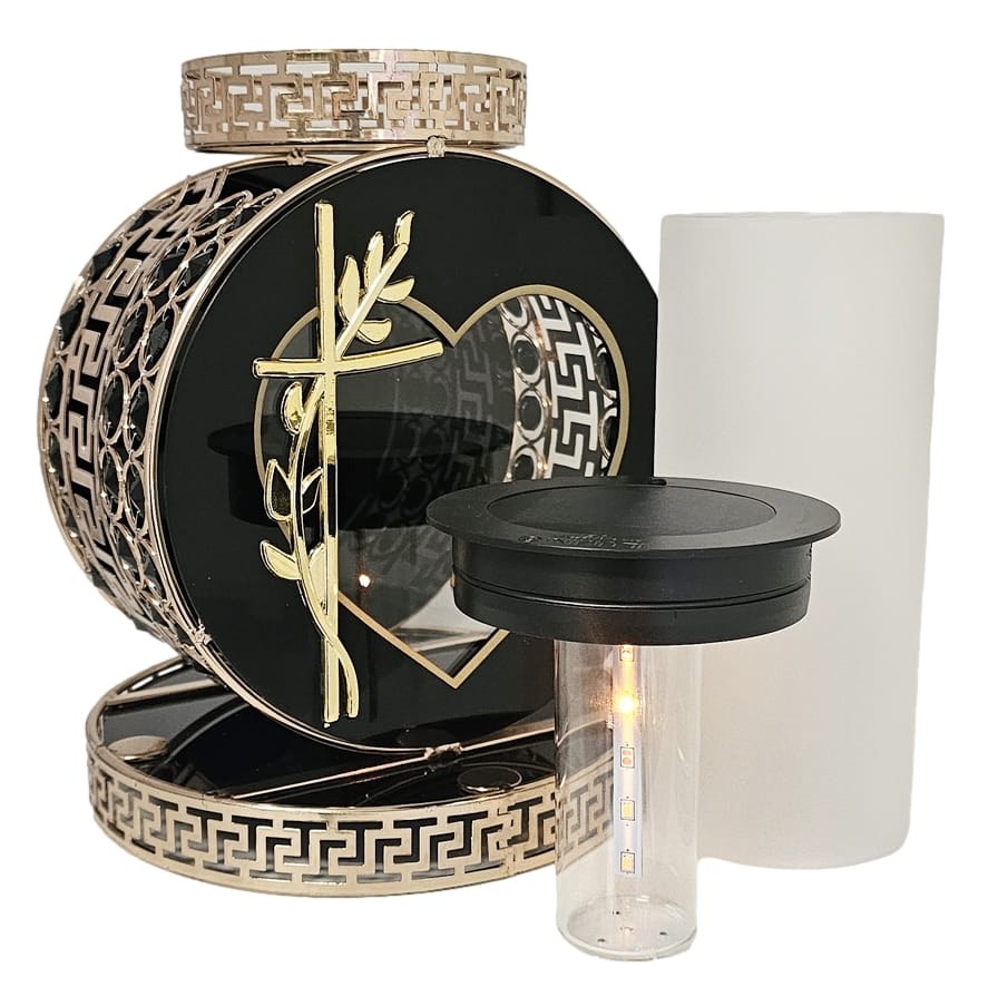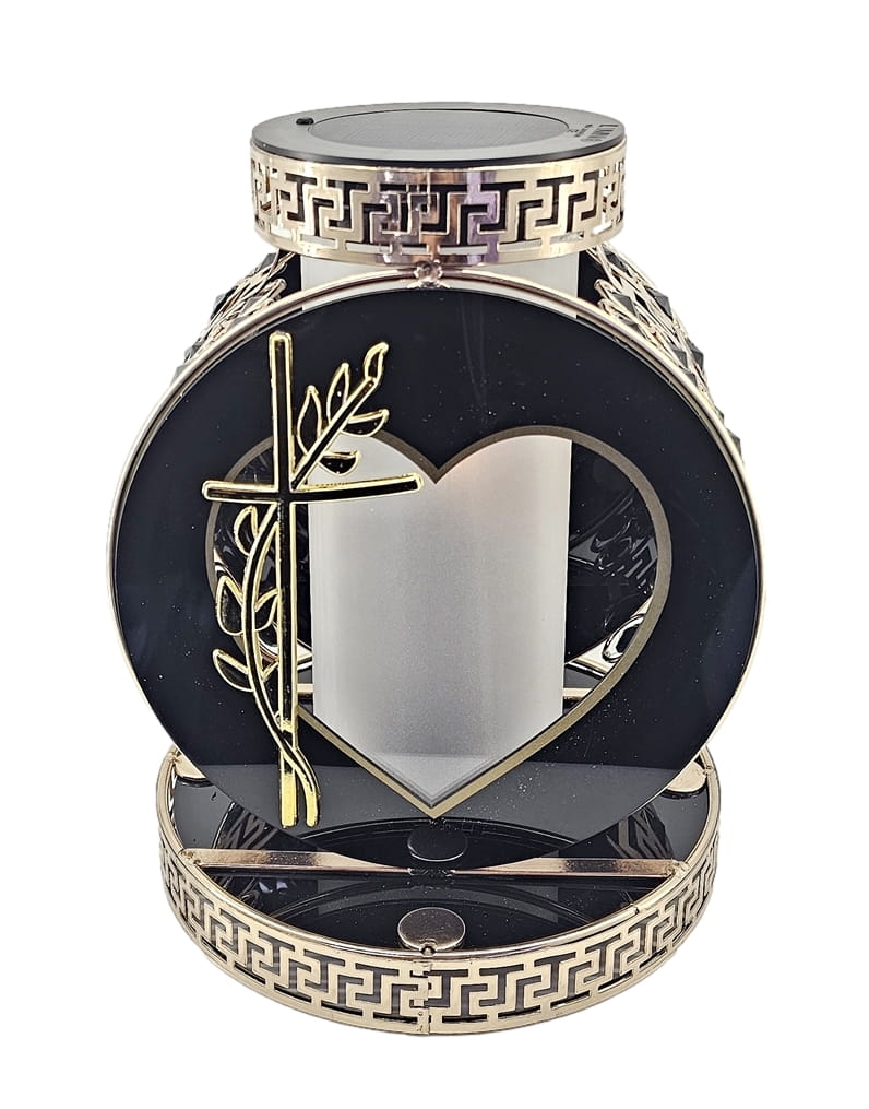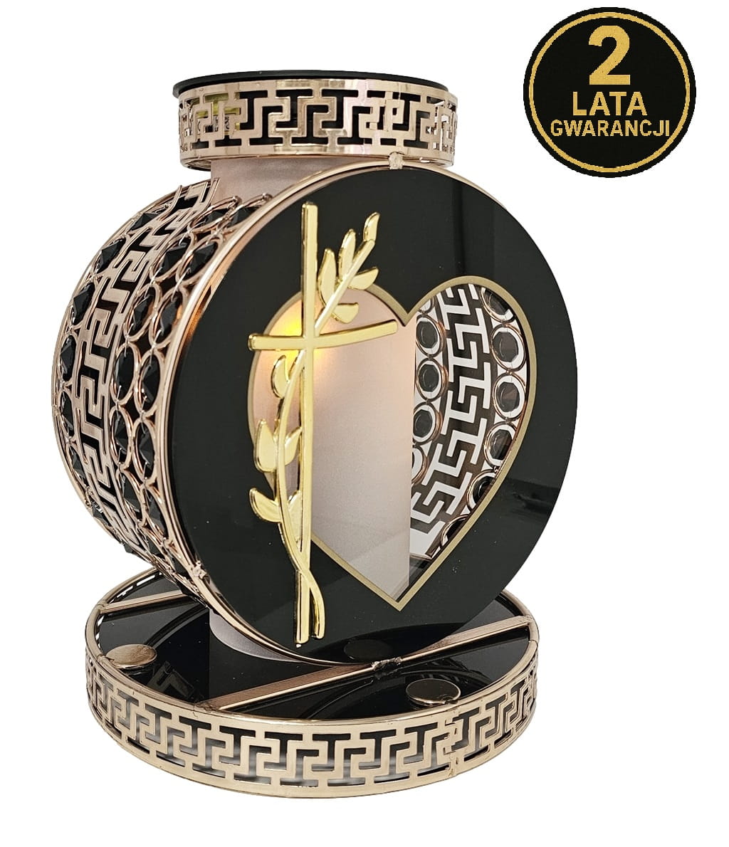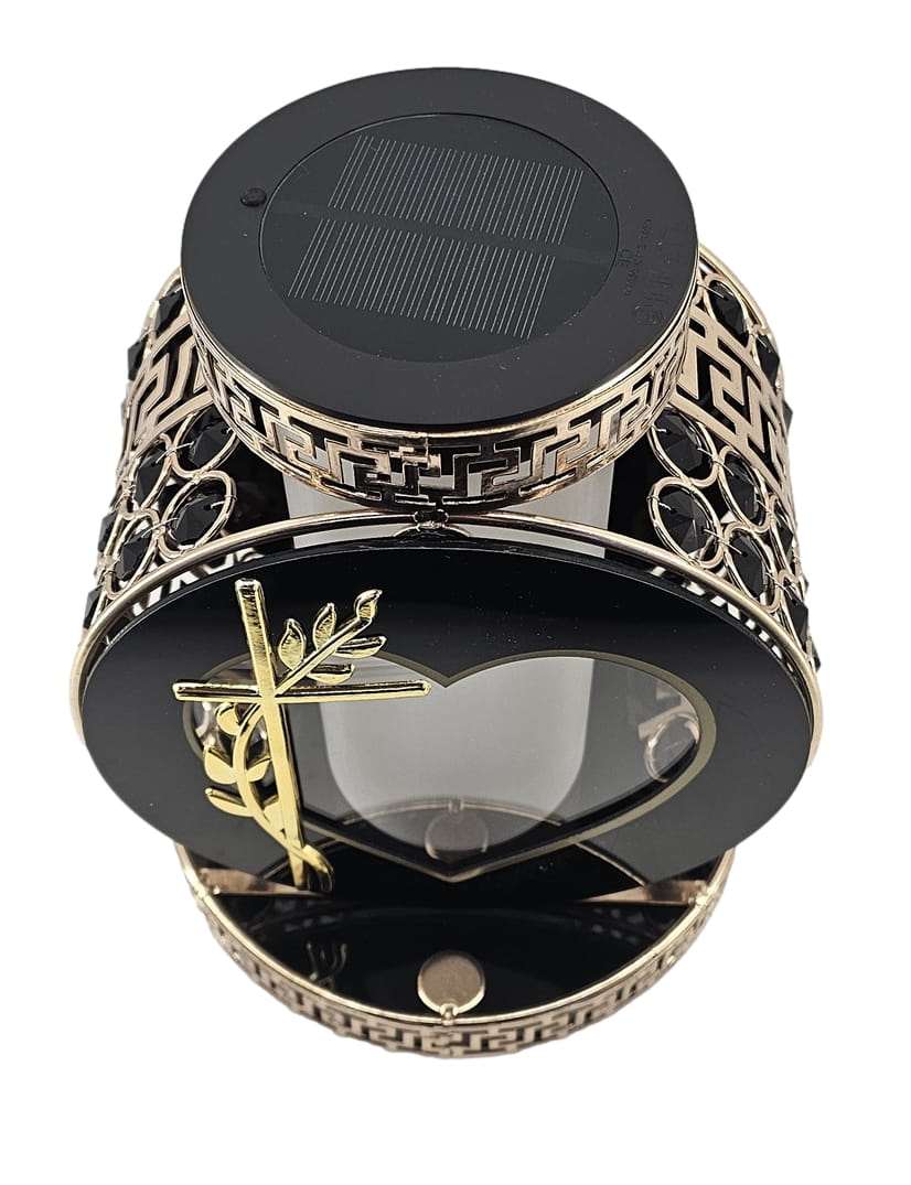 - kolor znicza: Złoto czarny+ czarny dekor. Podstawa z metalu+ akryl, pokrywa z panelem solarnym