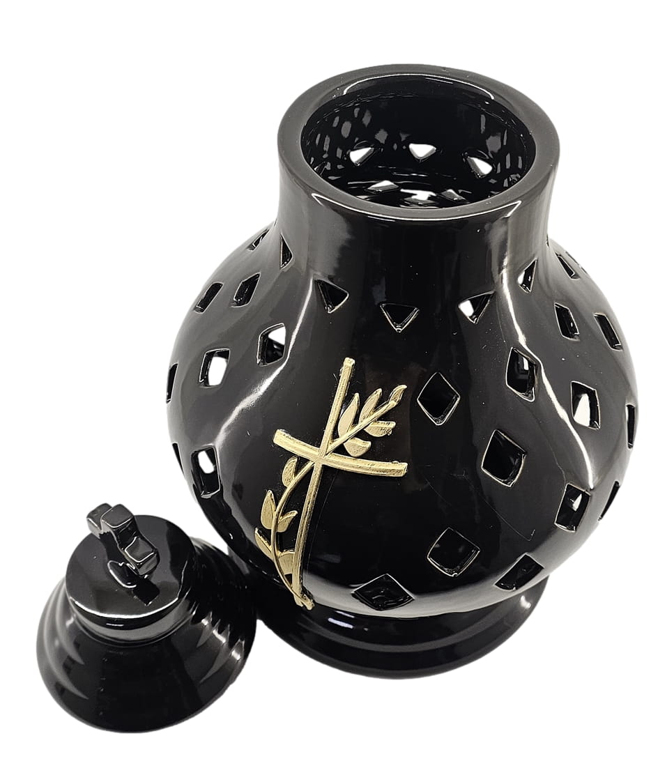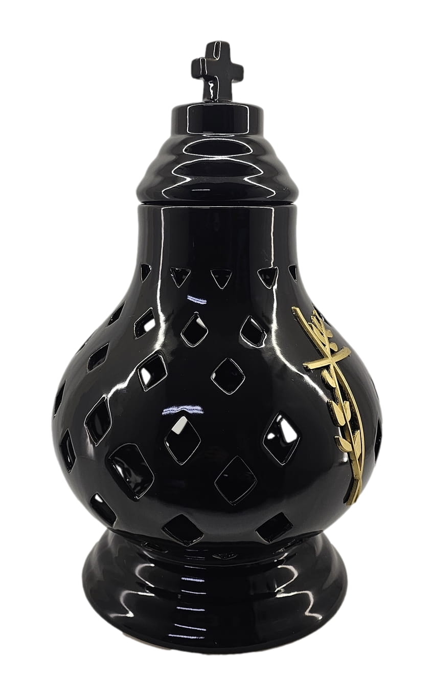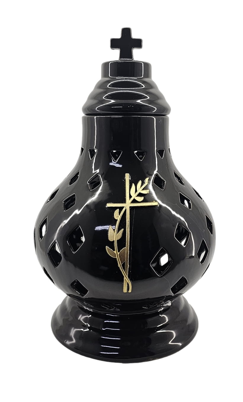 - kolor znicza: Czarny. Pokrywa i podstawa z czarnej lakierowanej ceramiki .